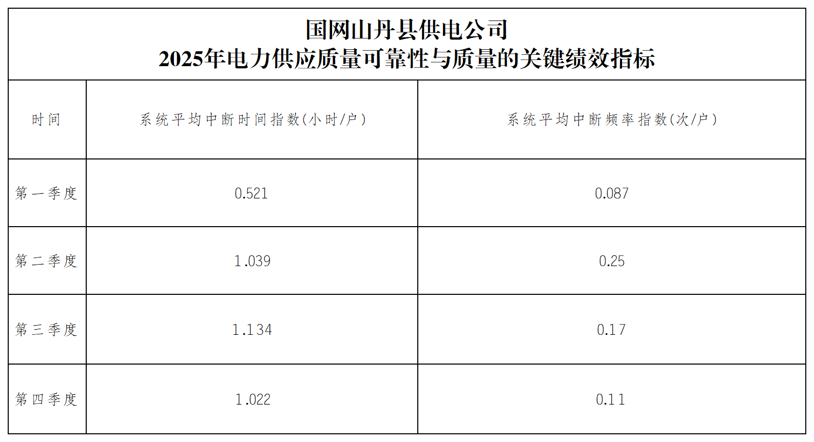 为进一步加强全县供电可靠性管理,持续提升全县供电服务水平和供电能力,按照《国家能源局关于印发〈供电企业信息公开实施办法〉的通知》(国能发监管规〔2021〕56号)文件相关要求,现对2025年电力供应质量可靠性与质量的关键绩效指标公示如下: