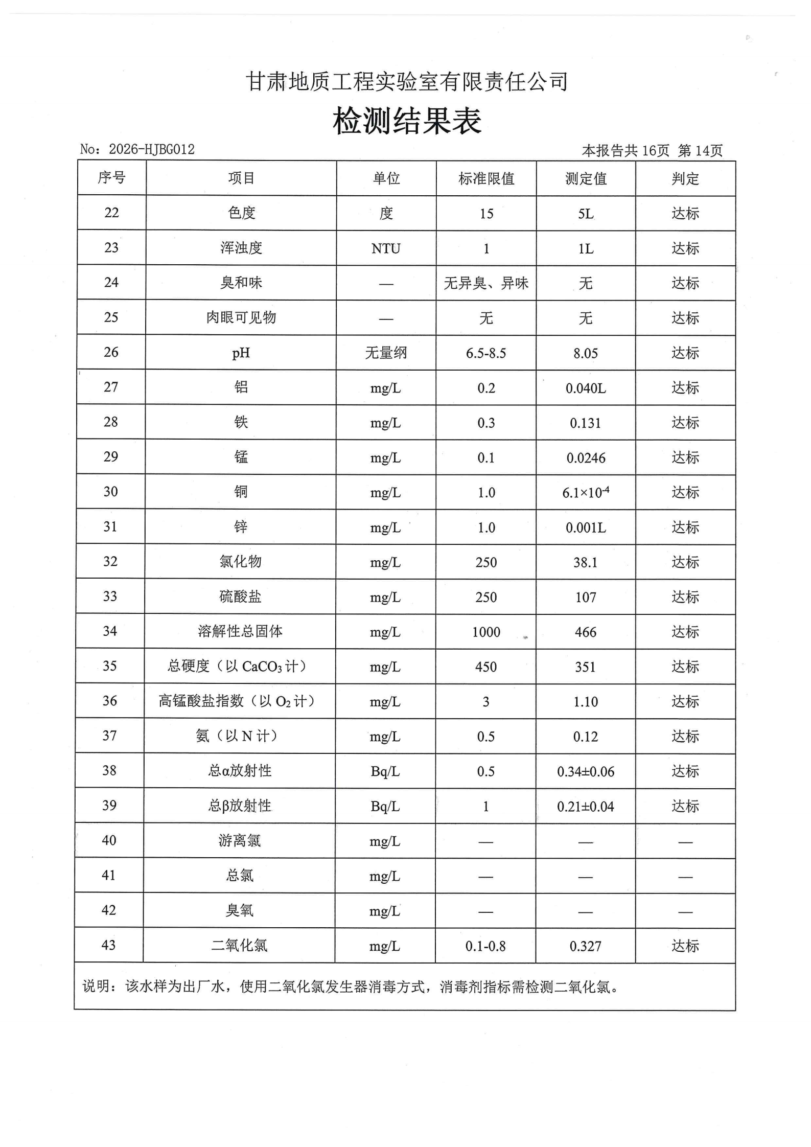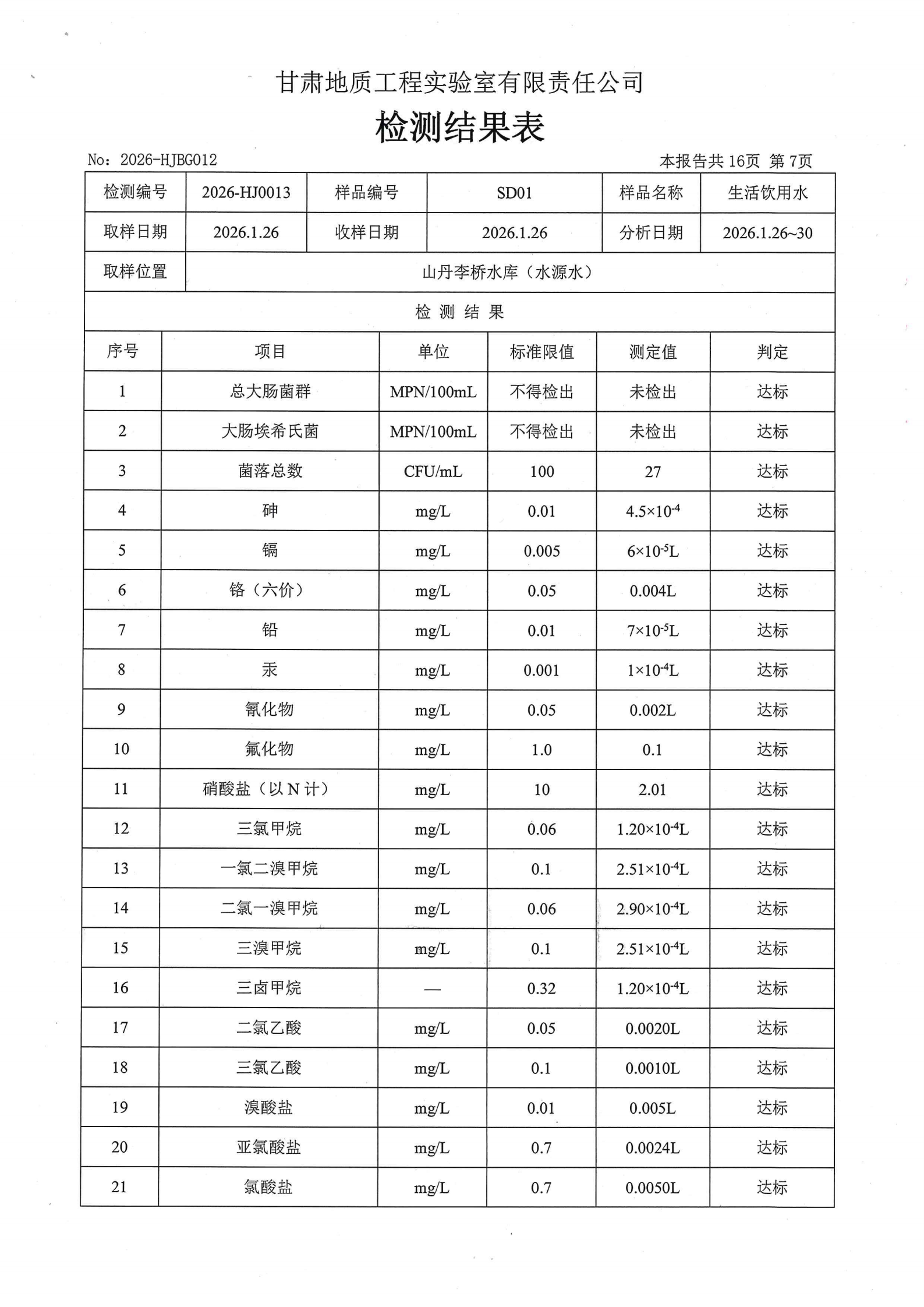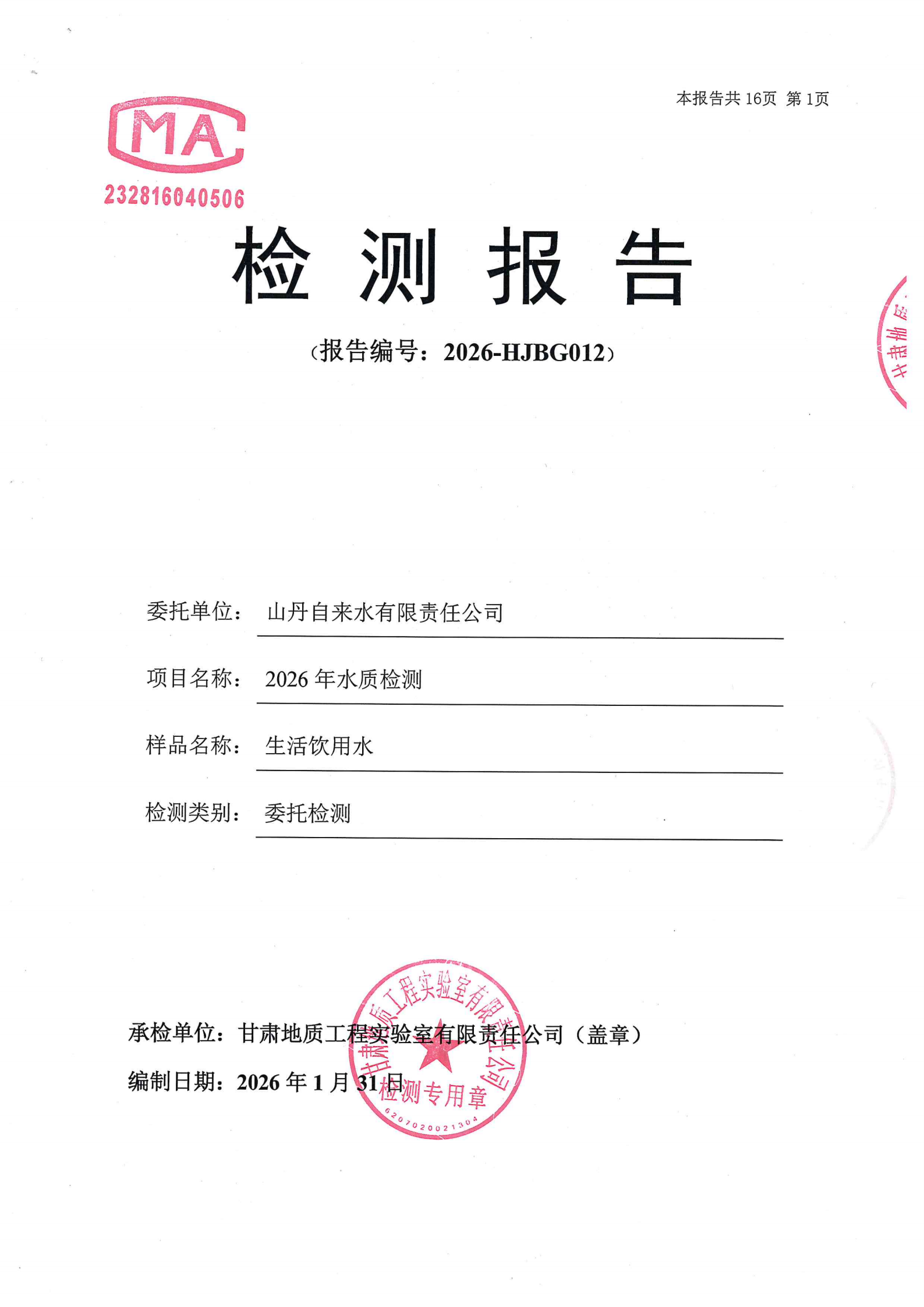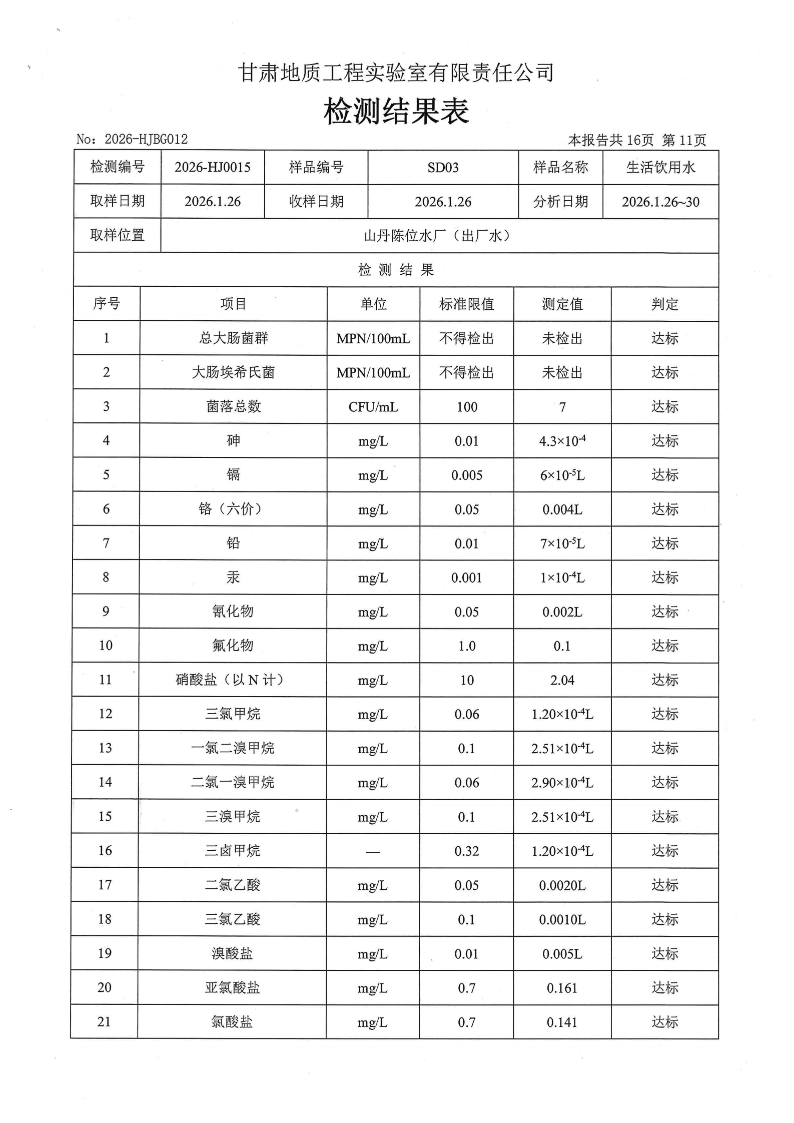 现将2026年第一季度生活饮用水水质检测信息公开如下: