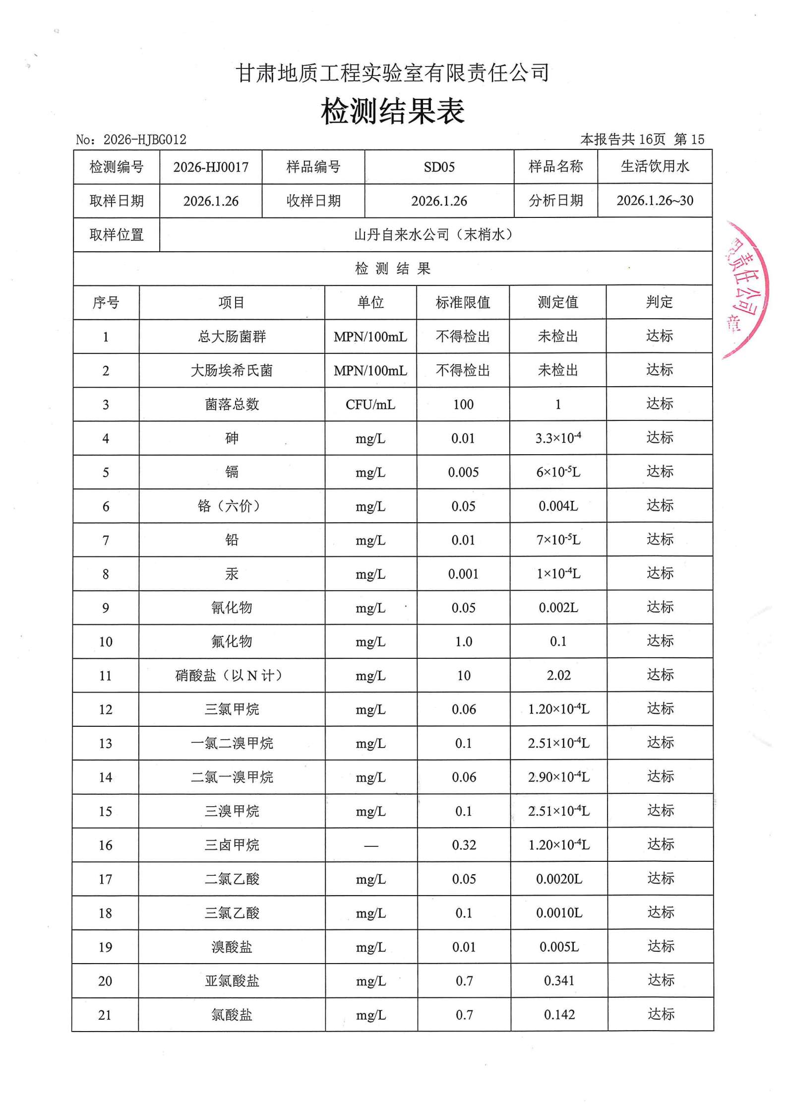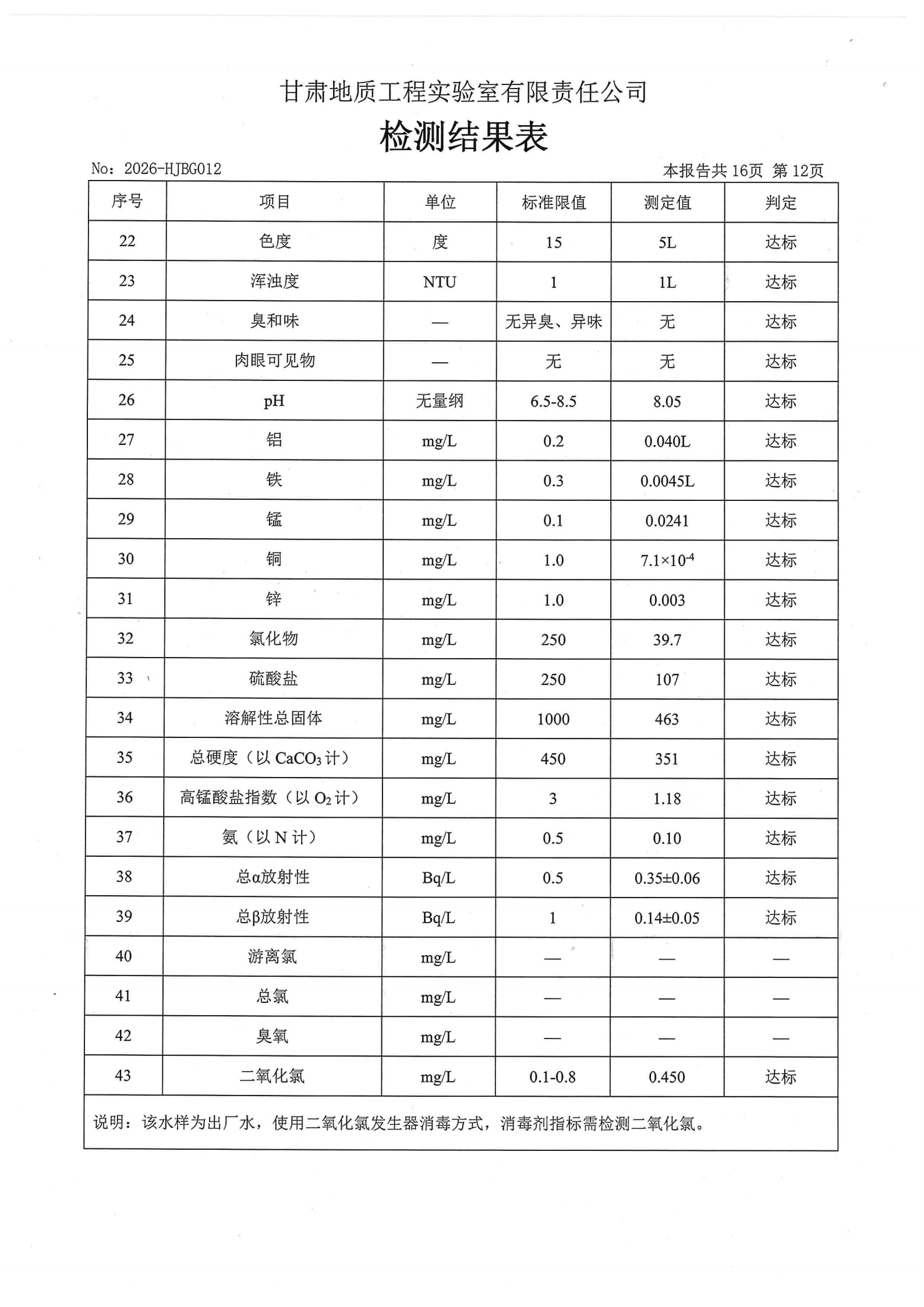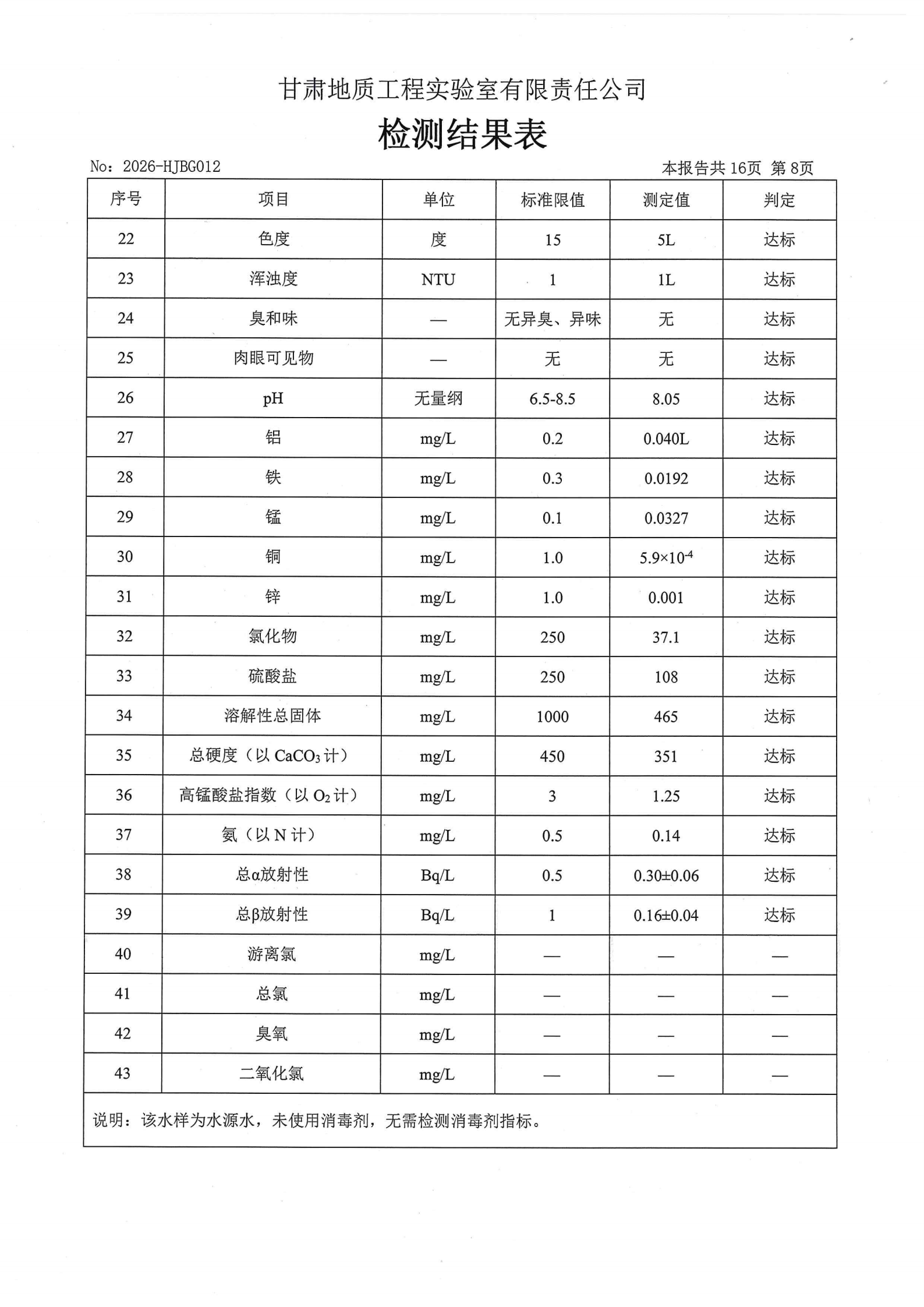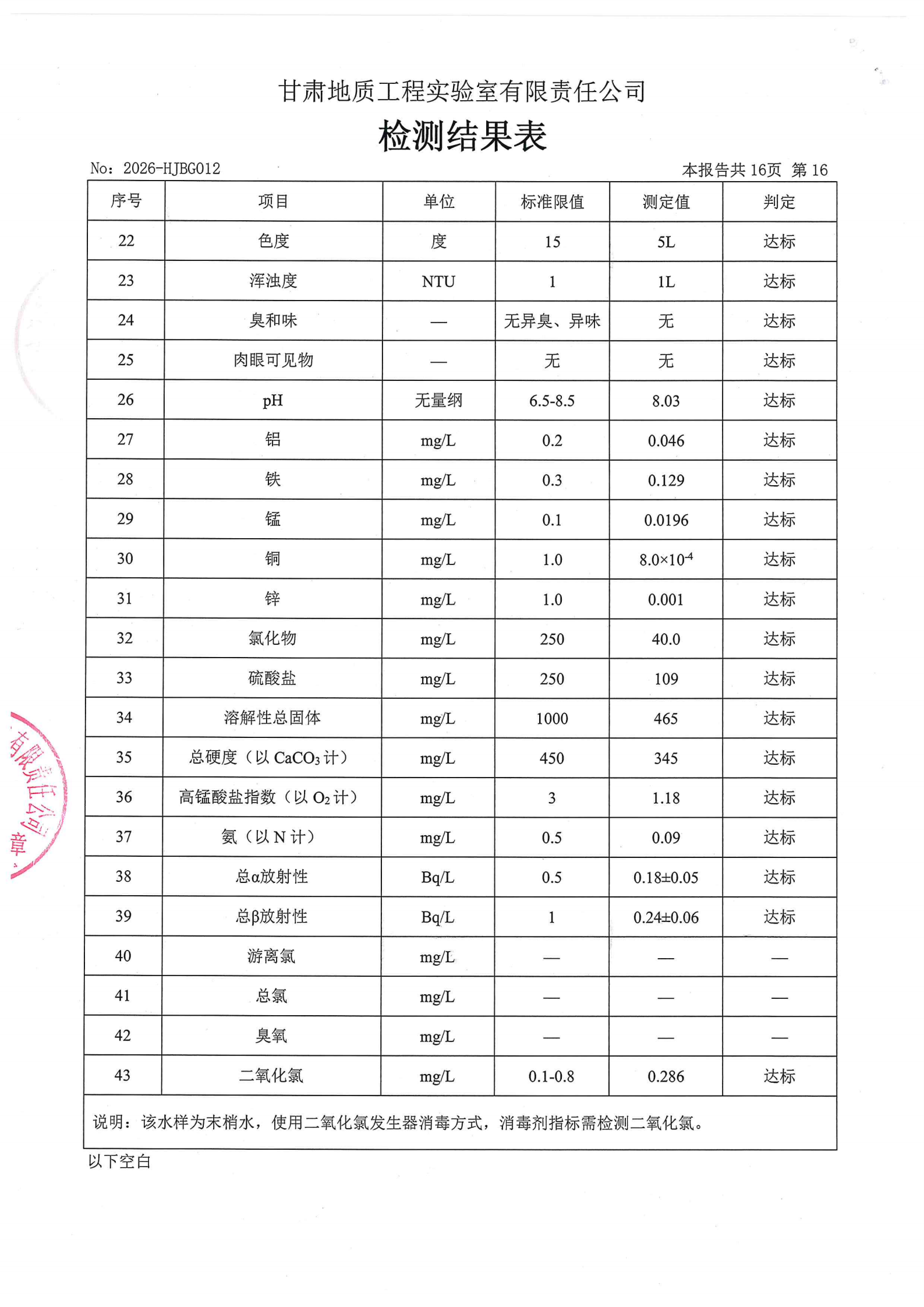 现将2026年第一季度生活饮用水水质检测信息公开如下: