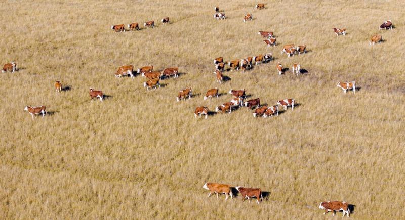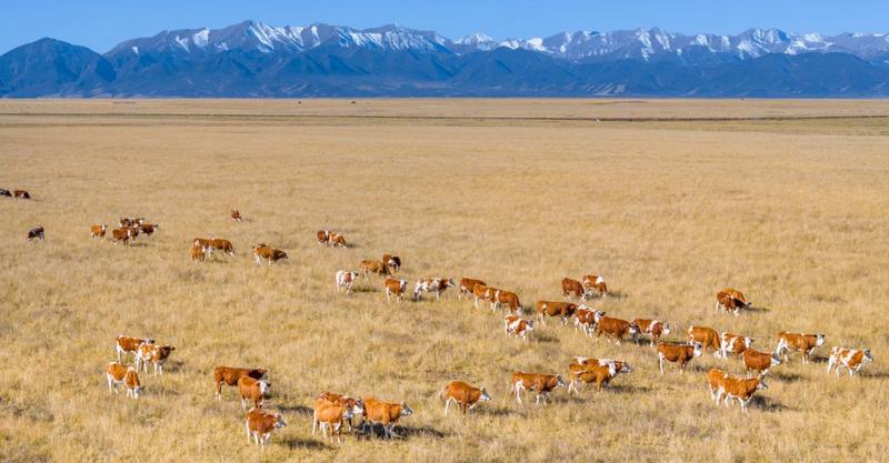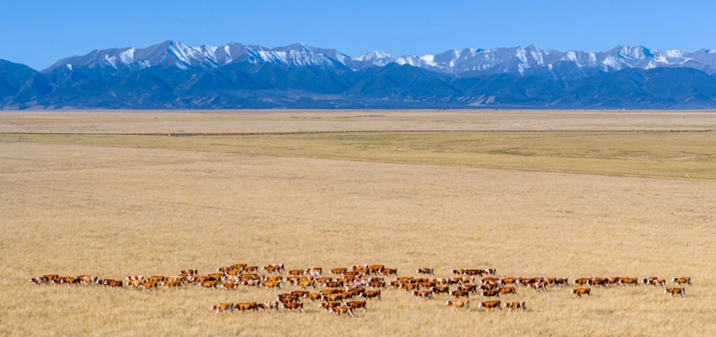 金秋时节,山丹马场草原褪去了夏季的翠绿,换上了金色的盛装,连绵起伏的山脉层峦叠嶂,山尖覆盖着皑皑白雪,与近处的金黄草地、西门塔尔牛群相映成趣,构成了一幅草原生态保护、产业绿色转型的新画卷。