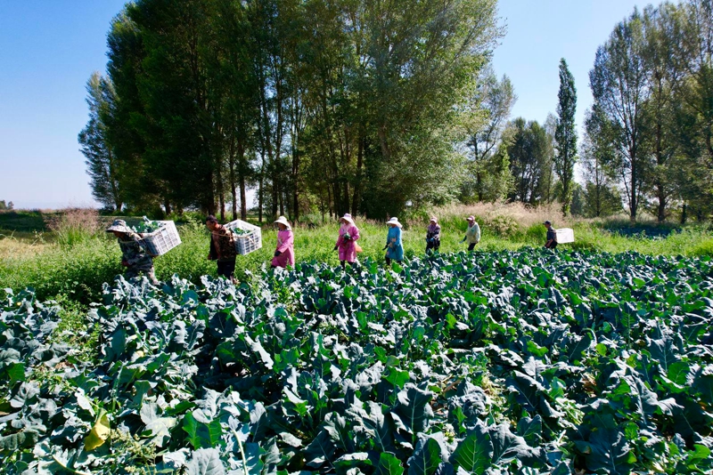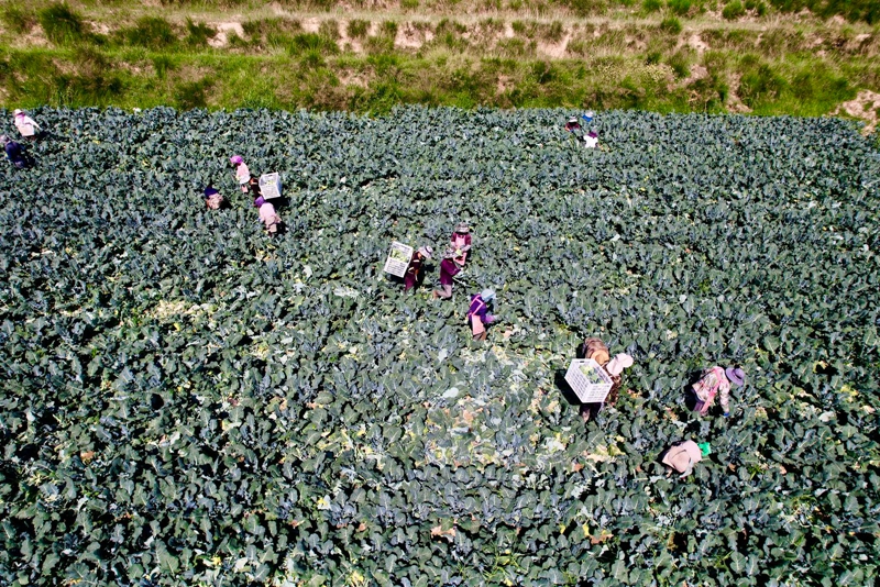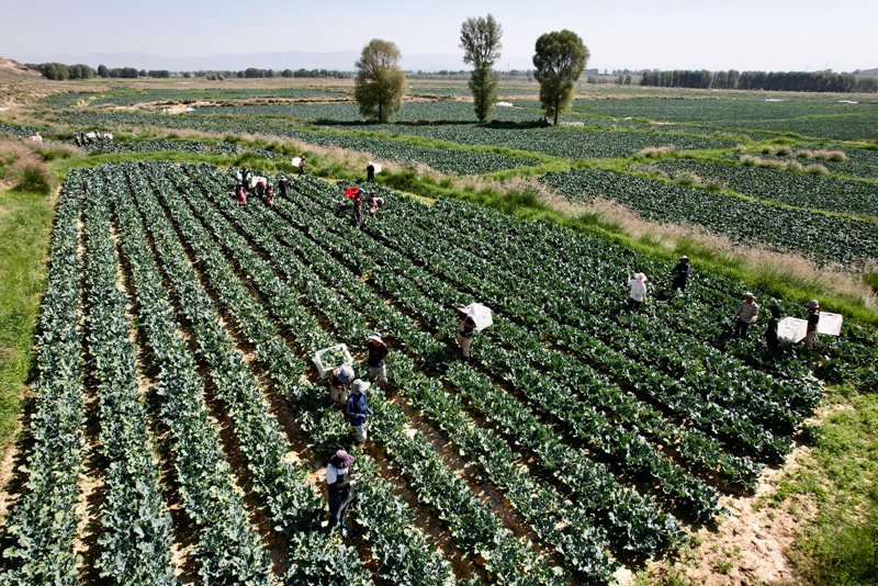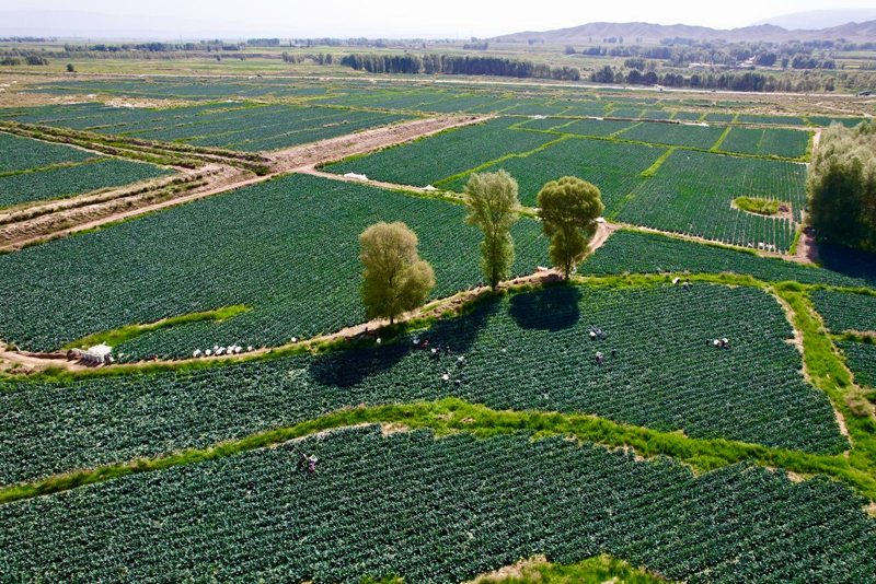 仲夏时节,山丹县李桥乡千亩西蓝花种植基地迎来丰收季。极目远眺,整齐排列的一垄垄翠绿西蓝花绵延起伏,犹如碧波翻涌的绿浪,与田间穿梭忙碌的采收村民相映成趣,绘就出一幅生机勃勃的丰收画卷。