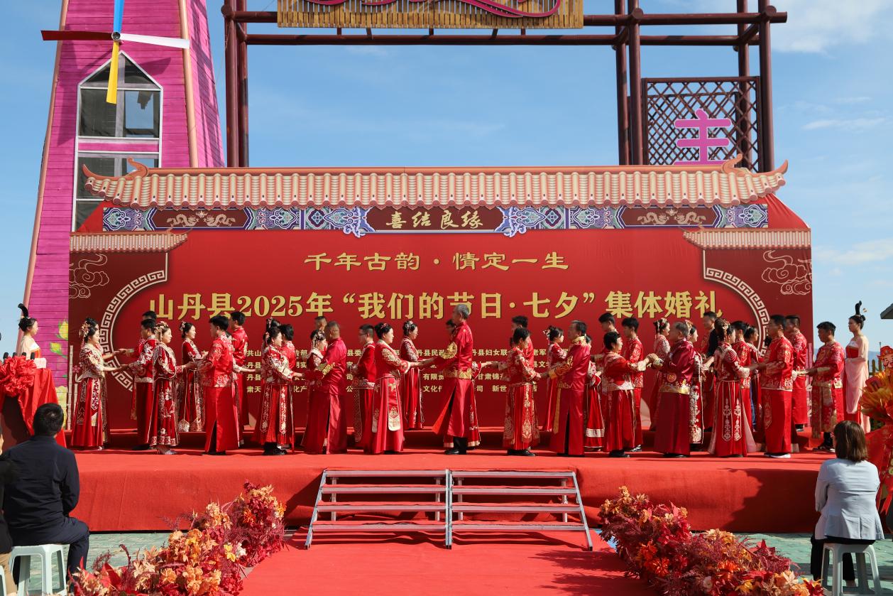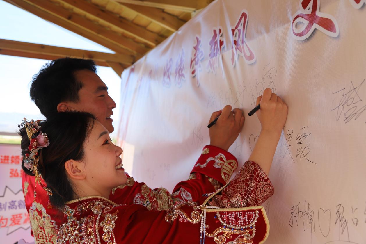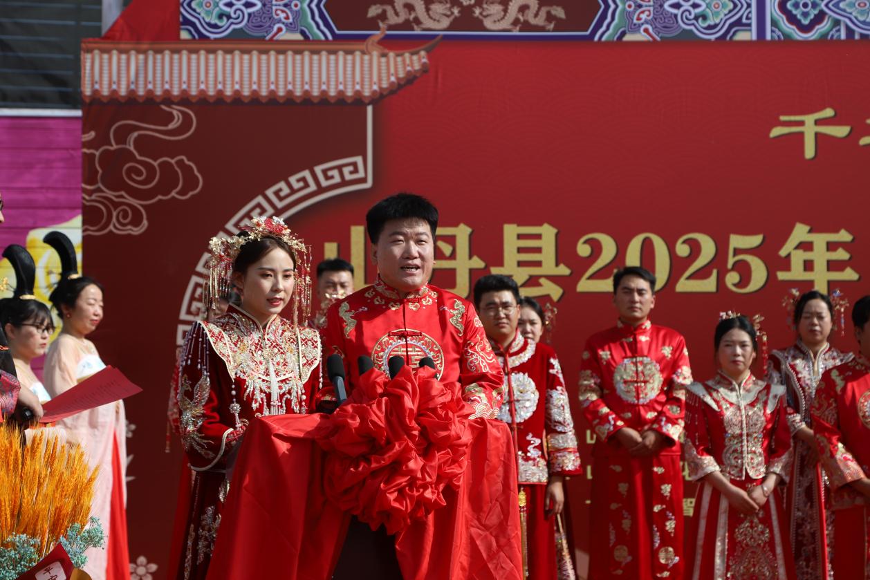 在老军乡玫瑰之约主题庄园,16对新人们身着传统服饰,完成了三拜三叩礼、合卺礼等传统婚俗环节,在亲友与游客的见证下,感受中华优秀传统文化的厚重与浪漫。新人们主动宣读婚俗改革倡议书,承诺抵制高额彩礼,以实际行动践行文明婚姻观,引导更多的新人珍视婚姻、守护家庭。