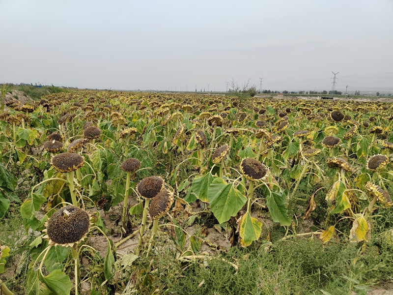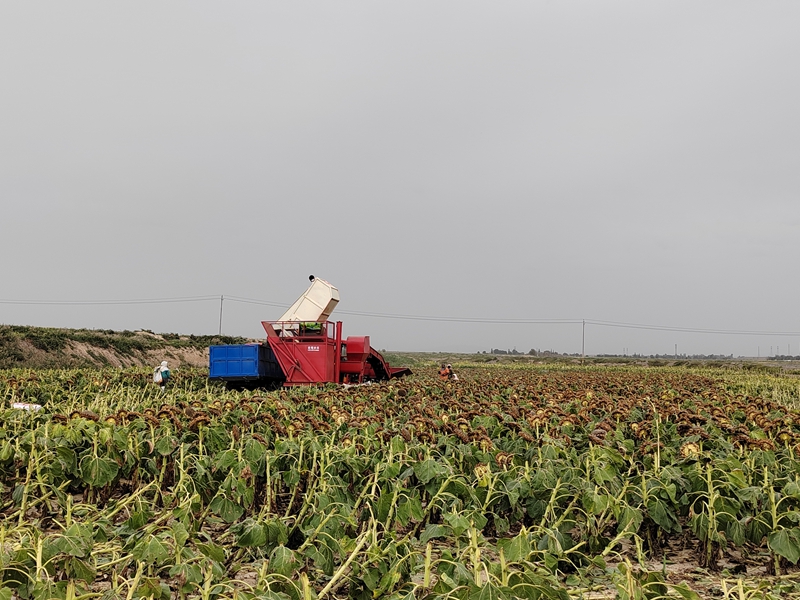 西屯村村委会主任黄爱宏介绍:“我们从8月10日开始人工收割葵花,再过四五天就完事了。今年雨水挺好,预计每亩能产290多公斤,丰收在望了!这里务工的人员都是附近的村民,每天用工60多人,一天能挣两百块钱。”
