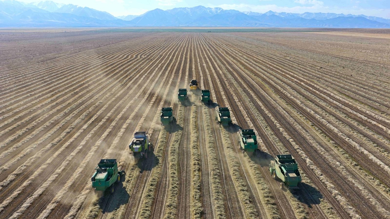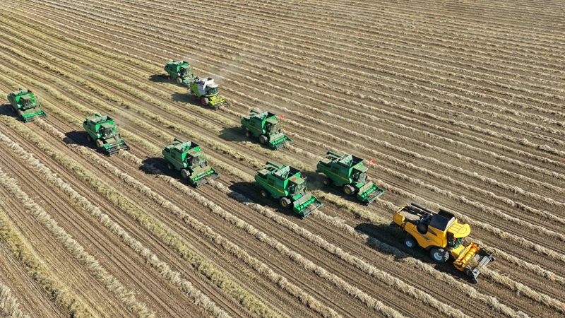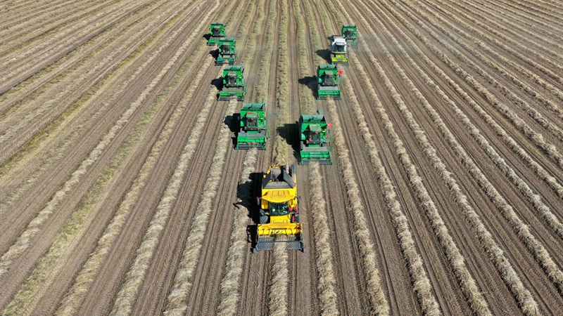 位于河西走廊中部的山丹马场,海拔高、气候冷凉,得天独厚的自然条件使其成为高原夏菜和优质粮油作物的重要产区。时下,油菜等作物相继成熟,连片农田宛如金色织毯,铺展至祁连山脚下。收割机群开足马力,有序推进,一次性完成作物的收割、脱粒和秸秆处理,大大提升了收割效率。