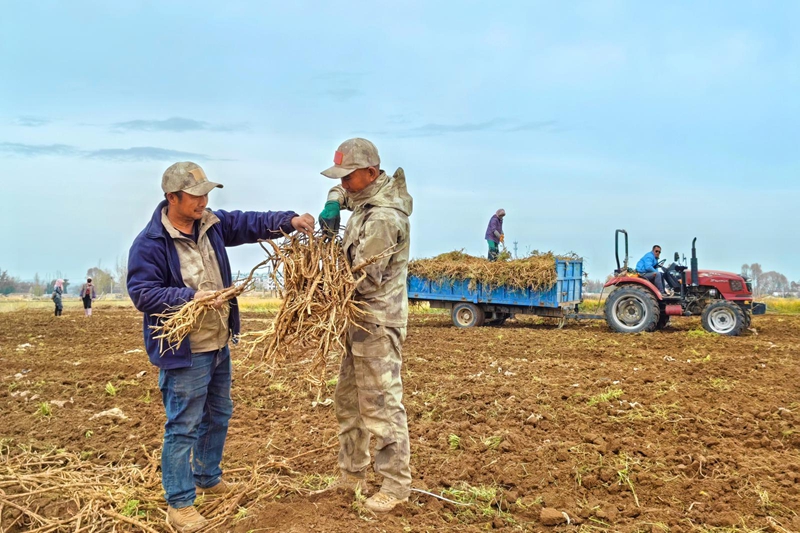 深秋时节,寒意渐浓。而山丹县霍城镇西关村的1600亩黄芪种植基地里,却是一派机器轰鸣、人声鼎沸的丰收盛景。割秧机、还田机、筛药机轮番作业,80余名工作人员分工协作,机械化与人工高效联动,金色田野上涌动着增收致富的热切期盼。