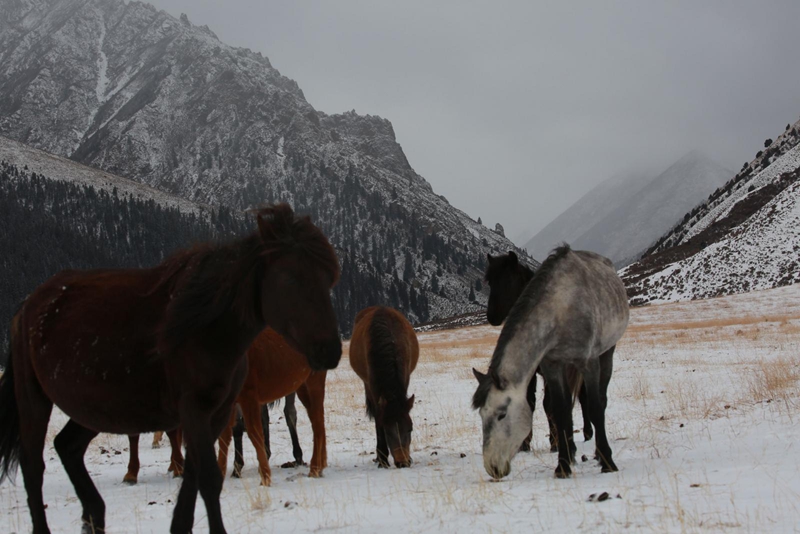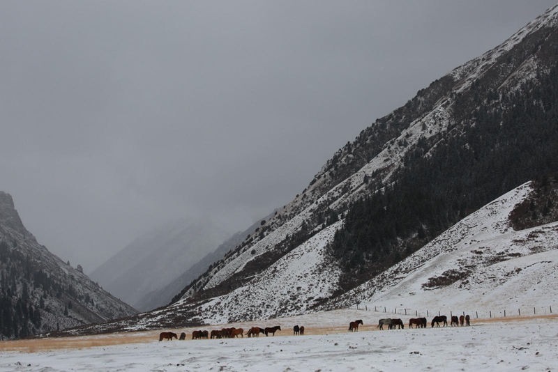 近日,受强冷空气影响,位于甘肃省祁连山北麓的山丹马场迎来了冬天第一场雪。