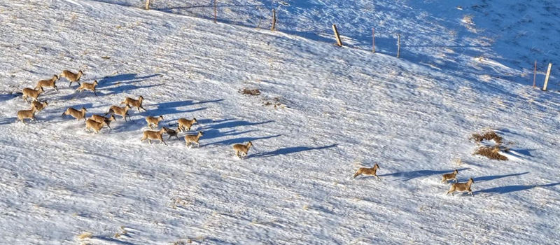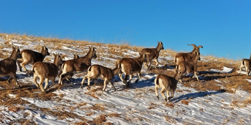 雪后,成群的岩羊在雪地里或悠闲踱步,或低头觅食,为静谧的雪原注入了勃勃生机。它们矫健的身影与洁白的雪地、湛蓝的天空共同构成了一幅幅动感十足的油画,展现了力量与自然的和谐之美。