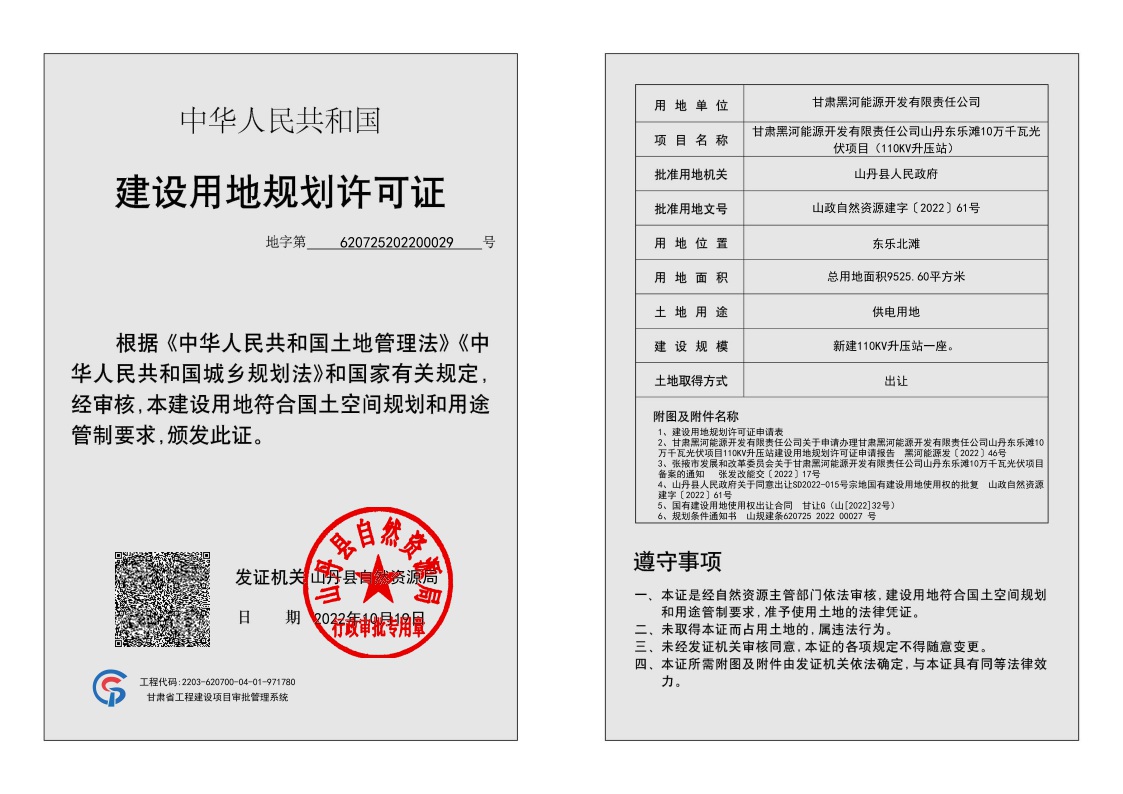 甘肃黑河能源开发有限责任公司山丹东乐滩10万千瓦光伏项目(110KV升压站)建设用地规划许可证