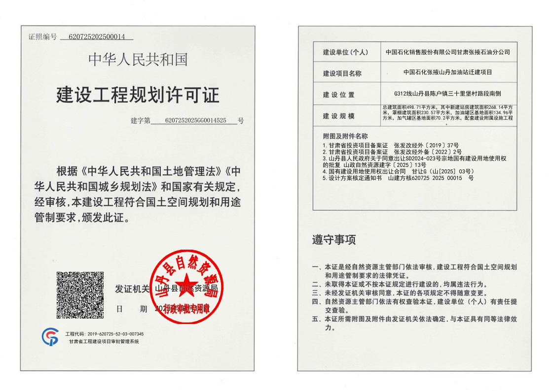 中国石化张掖山丹加油站迁建项目建设工程规划许可证