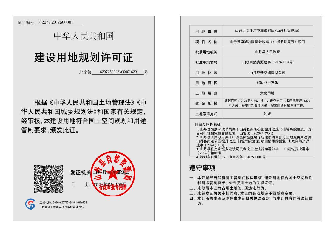 山丹县南湖公园提升改造(仙堤书院复原)项目建设用地规划许可证
