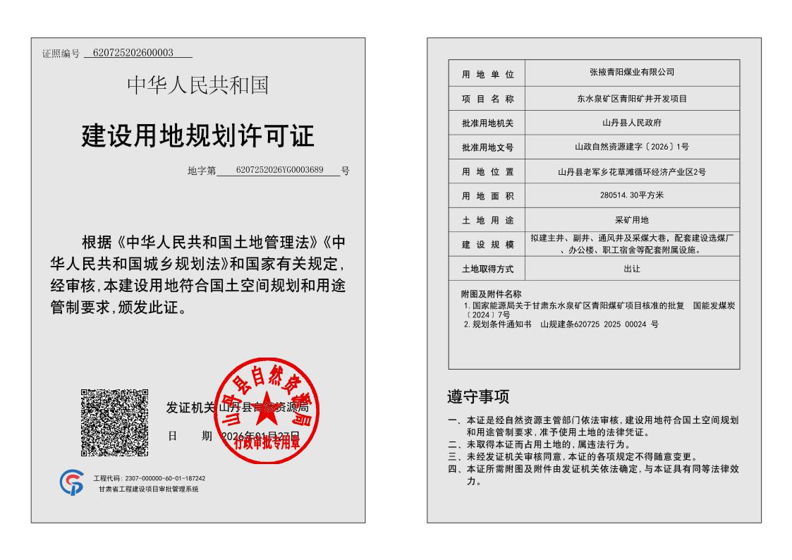 东水泉矿区青阳矿井开发项目建设用地规划许可证