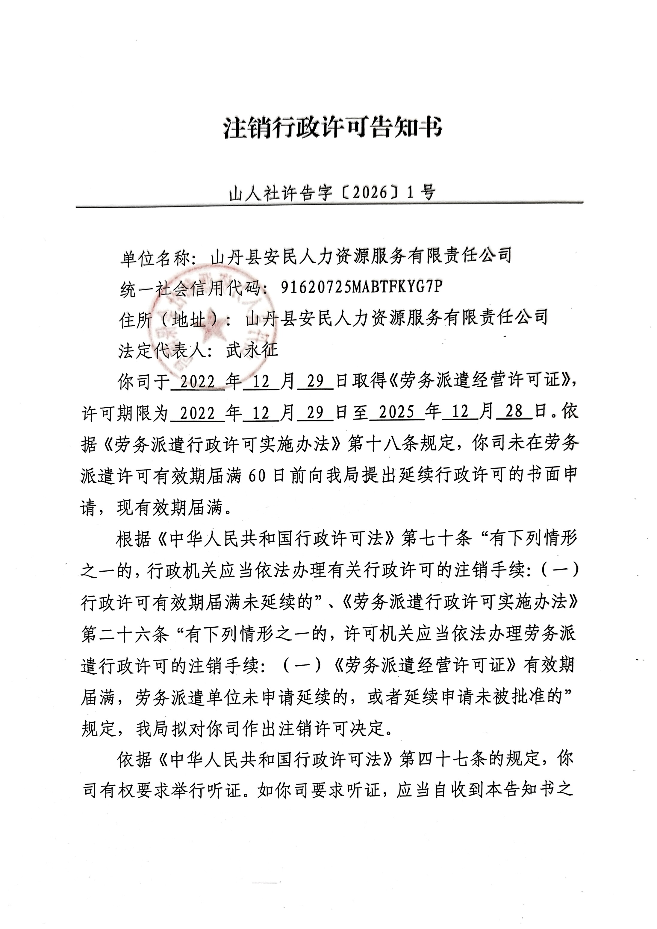 关于《注销行政许可告知书》(山人社许告字〔2026〕1号)的送达公告