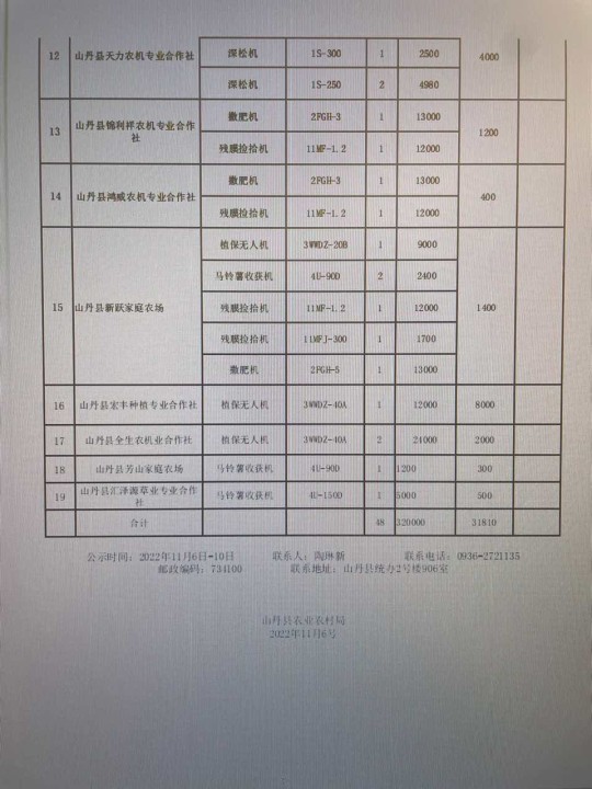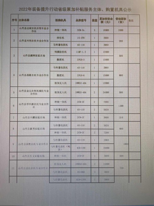 关于2022年装备提升行动省级累加补贴服务主体、购置机具公示