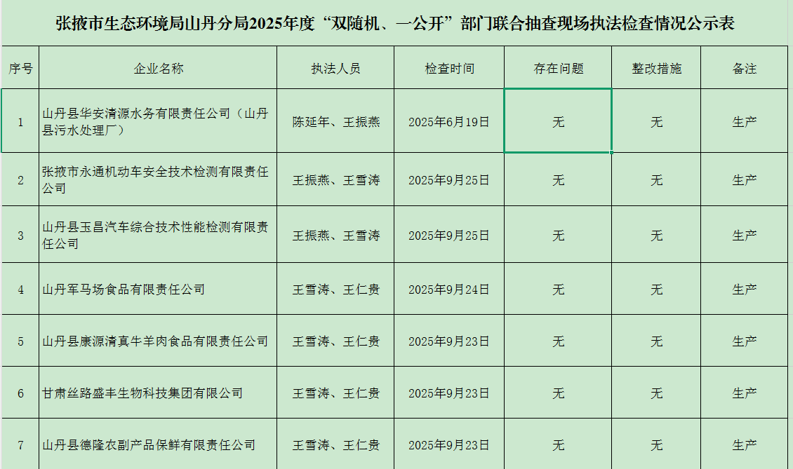 按照公示要求,现将张掖市生态环境局山丹分局2025年度“双随机、一公开”部门联合抽查现场执法检查情况公示如下: