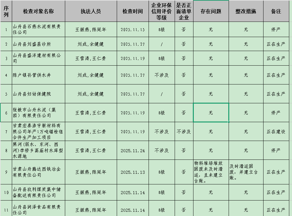 现将张掖市生态环境局山丹分局2025年11月份“双随机、一公开”现场检查情况公示如下: