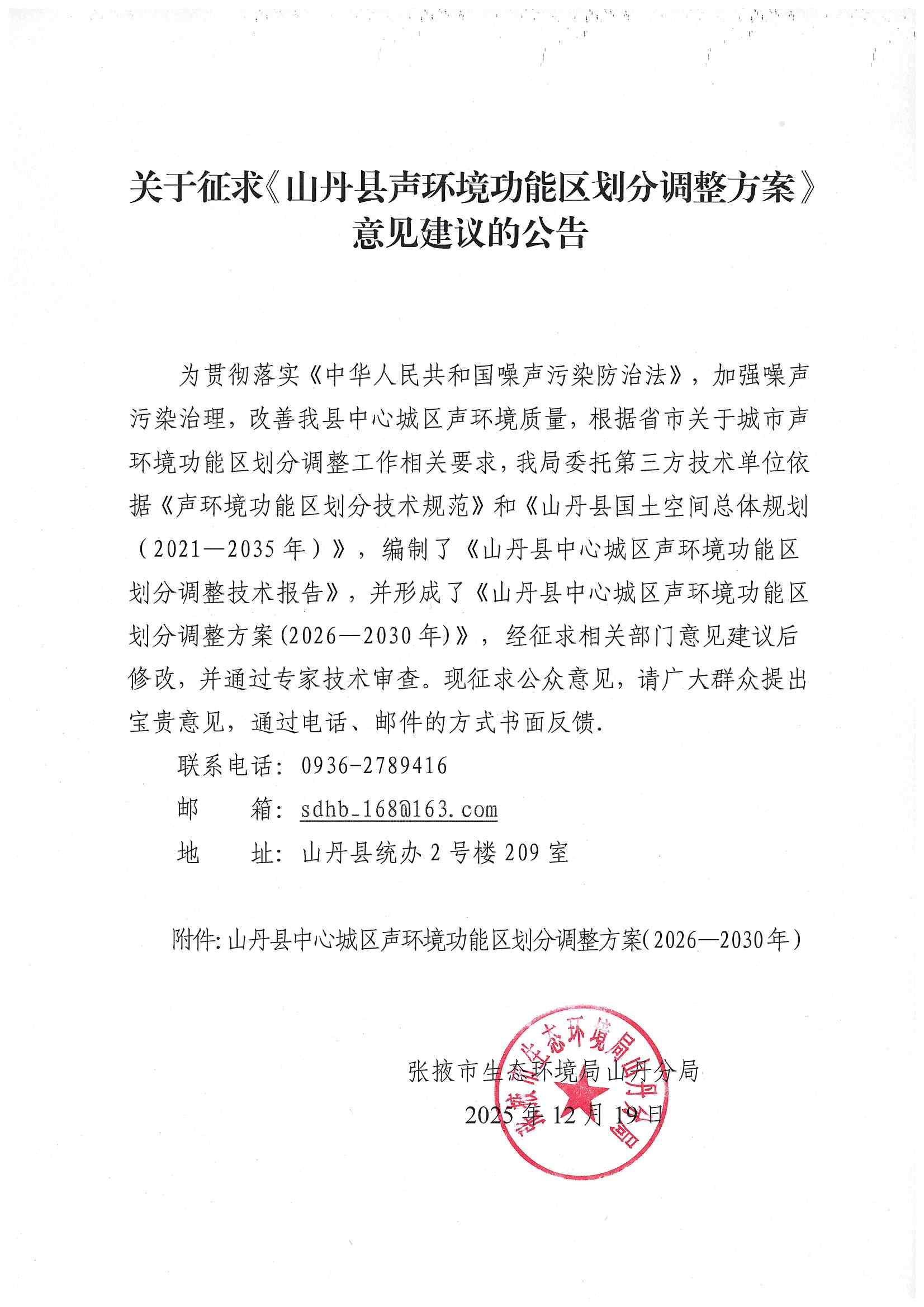 关于征求《山丹县声环境功能区划分调整方案》意见建议的公告