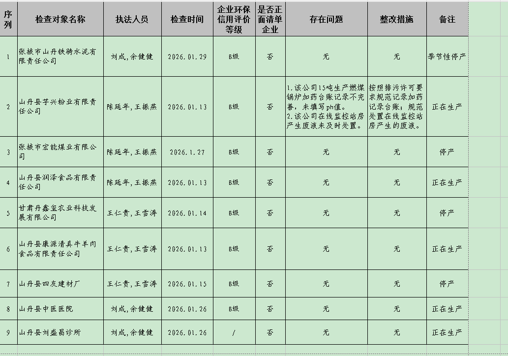 张掖市生态环境局山丹分局2026年1月份“双随机、一公开”现场检查情况公示