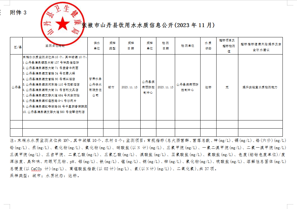 山丹县卫生健康局2023年饮用水水质信息11月份结果公示