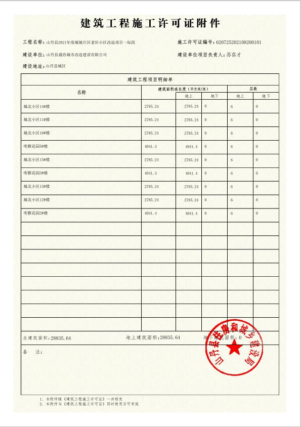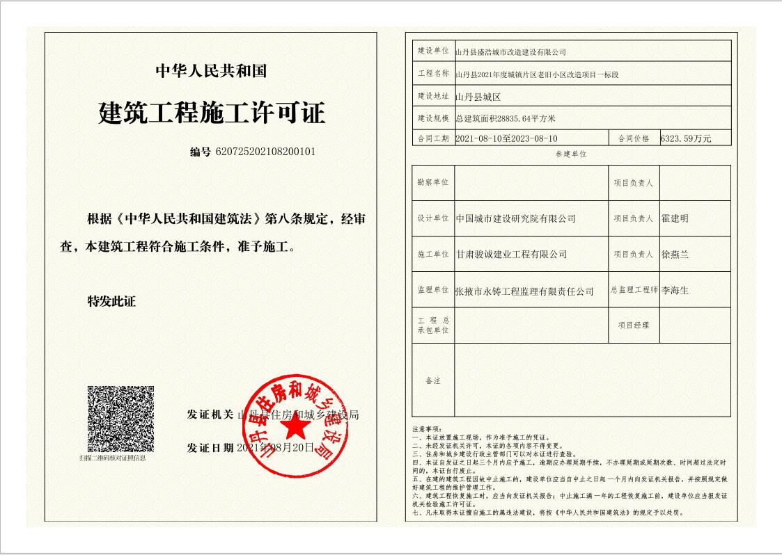 山丹县2021年度城镇片区老旧小区改造项目一标段施工许可证