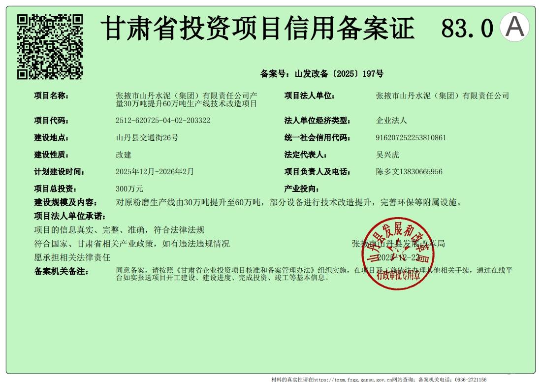 张掖市山丹水泥(集团)有限责任公司产量30万吨提升60万吨生产线技术改造项目