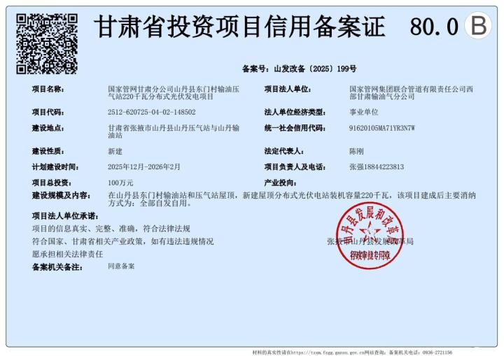 国家管网甘肃分公司山丹县东门村输油压 气站220千瓦分布式光伏发电项目