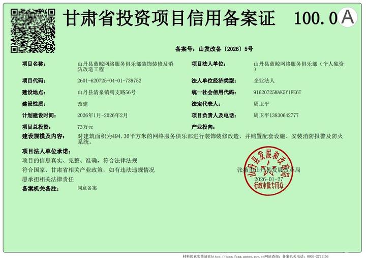 山丹县蓝鲸网络服务俱乐部装饰装修及消防改造工程