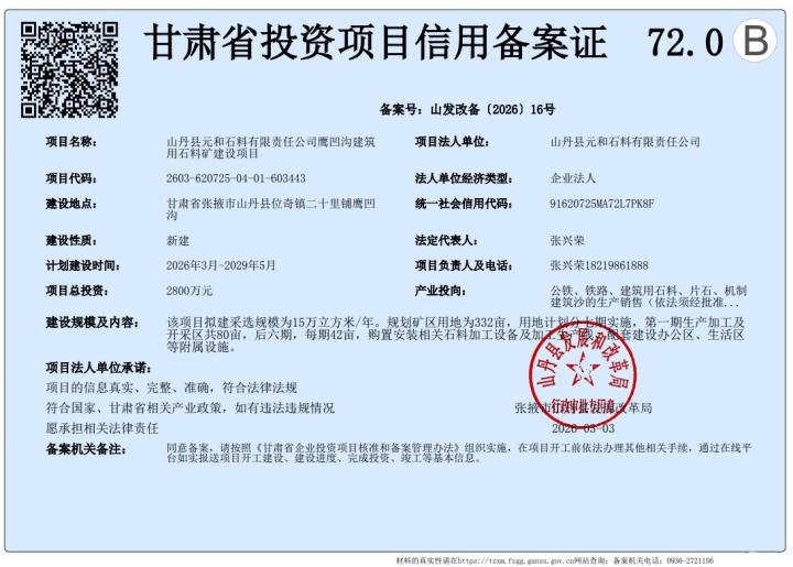 山丹县元和石料有限责任公司鹰凹沟建筑用石料矿建设项目