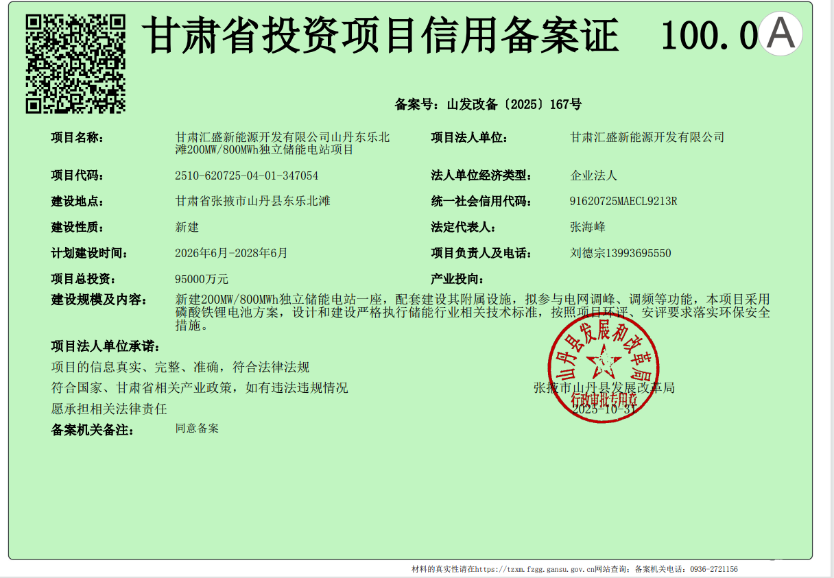 甘肃汇盛新能源开发有限公司山丹东乐北 滩200MW800MWh独立储能电站项目