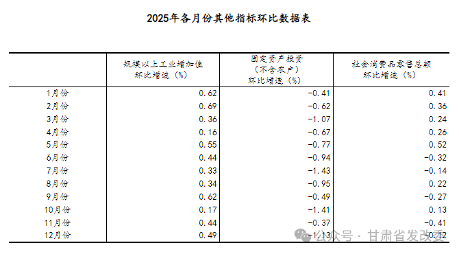 (2)根据季节调整模型自动修正结果,对近一年来各期国内生产总值、规模以上工业增加值、固定资产投资(不含农户)、社会消费品零售总额环比增速进行修订。修订结果及2025年四季度GDP环比数据、2025年12月份其他指标环比数据如下: