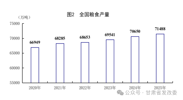 全年全国粮食总产量71488万吨,比上年增加838万吨,增长1.2%。其中,夏粮产量14975万吨,下降0.1%;早稻产量2851万吨,增长1.2%;秋粮产量53662万吨,增长1.5%。分品种看,小麦产量14007万吨,基本持平;玉米产量30124万吨,增长2.1%;稻谷产量20904万吨,增长0.7%;大豆产量2091万吨,增长1.3%。全年猪牛羊禽肉产量10072万吨,比上年增长4.2%,首次超过1亿吨。其中,猪肉产量5938万吨,增长4.1%;牛肉产量801万吨,增长2.8%;羊肉产量496万吨,下降4.2%;禽肉产量2837万吨,增长6.7%。牛奶产量4091万吨,增长0.3%;禽蛋产量3498万吨,下降2.5%。全年生猪出栏71973万头,增长2.4%;年末生猪存栏42967万头,增长0.5%。