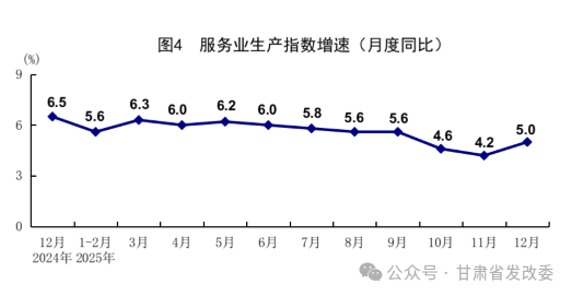 全年服务业增加值比上年增长5.4%。其中,信息传输、软件和信息技术服务业,租赁和商务服务业,交通运输、仓储和邮政业,批发和零售业,住宿和餐饮业增加值分别增长11.1%、10.3%、5.2%、5.0%、4.9%。12月份,服务业生产指数同比增长5.0%。其中,信息传输、软件和信息技术服务业,租赁和商务服务业,金融业生产指数分别增长14.8%、11.3%、6.5%。1—11月份,规模以上服务业企业营业收入同比增长7.8%。12月份,服务业商务活动指数为49.7%,比上月上升0.2个百分点;服务业业务活动预期指数为56.4%,上升0.5个百分点。其中,电信广播电视及卫星传输服务、货币金融服务、资本市场服务等行业商务活动指数均位于60.0%以上高位景气区间。