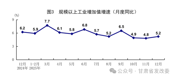 全年全国规模以上工业增加值比上年增长5.9%。分三大门类看,采矿业增加值增长5.6%,制造业增长6.4%,电力、热力、燃气及水生产和供应业增长2.3%。装备制造业增加值增长9.2%,高技术制造业增加值增长9.4%,增速分别快于规模以上工业3.3、3.5个百分点。分经济类型看,国有控股企业增加值增长4.6%;股份制企业增长6.3%,外商及港澳台投资企业增长3.9%;私营企业增长5.3%。分产品看,3D打印设备、工业机器人、新能源汽车产品产量分别增长52.5%、28.0%、25.1%。12月份,规模以上工业增加值同比增长5.2%,环比增长0.49%。12月份,制造业采购经理指数为50.1%,比上月上升0.9个百分点;企业生产经营活动预期指数为55.5%,上升2.4个百分点。1—11月份,全国规模以上工业企业实现利润总额66269亿元,同比增长0.1%。
