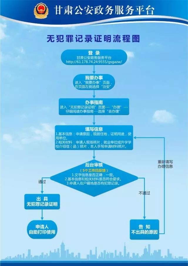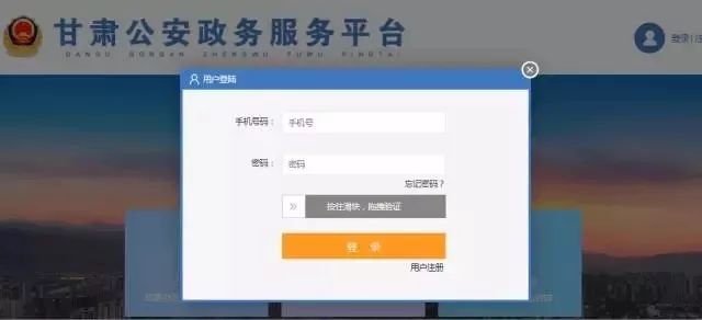 第二步 点击弹出框“甘肃公安政务服务平台”,如下图所示 第三步 出现如下图所示界面: 第四步 点击右上角的登录或注册按钮,会出现如下图所示界面: 第五步 输入已注册的手机号和密码,并拖移滑动条验证通过后,即可登录系统,如下图所示: 第六步 登录成功后,点击“我要办事”模块,出现如下图所示界面: 第七步 点击“无犯罪记录证明”,打开如下界面: 第八步 点击右上角的“去办理”按钮,即可出现如下所示界面: 第九步 按照申报页面提示填写相关信息,确认无误后点击页面底部“立即申报”按钮,即可出现如下所示提示: 第十步 点击“提交”按钮,出现如下页面: 第十一步 申报事项的办理进度可以在“个人中心”查询,重要的办理节点平台会自动给申请人的手机发送短信通知。