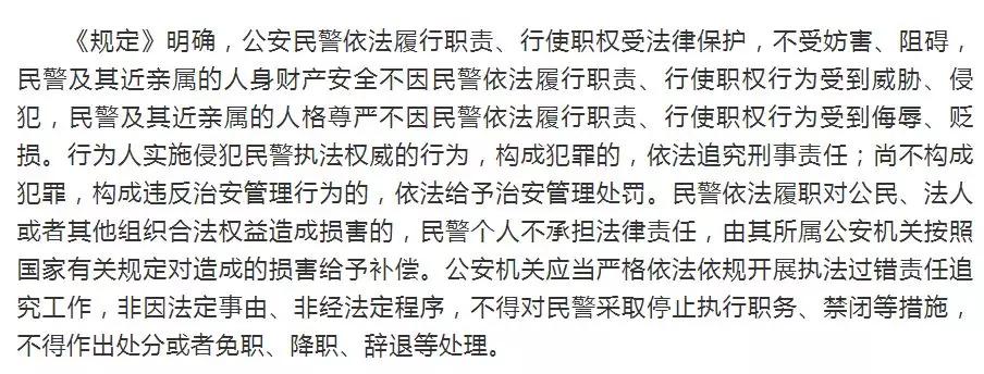 第三条 公安民警依法履行职责、行使职权受法律保护,不受妨害、阻碍,民警及其近亲属的人身财产安全不因民警依法履行职责、行使职权行为受到威胁、侵犯,民警及其近亲属的人格尊严不因民警依法履行职责、行使职权行为受到侮辱、贬损。