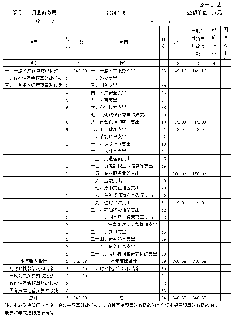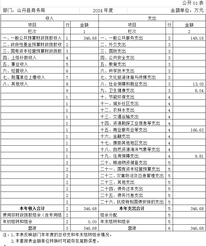 2024年度收、支总计均为346.68万元。与上年度相比,收、支总计各减少2130.75万元,下降86.01%,主要原因是我单位2024年5月因机构改革,单位合并,原商务局所有资金全部划入山丹县工业信息化和商务局账户,故收入支出较上年相比有所下降。