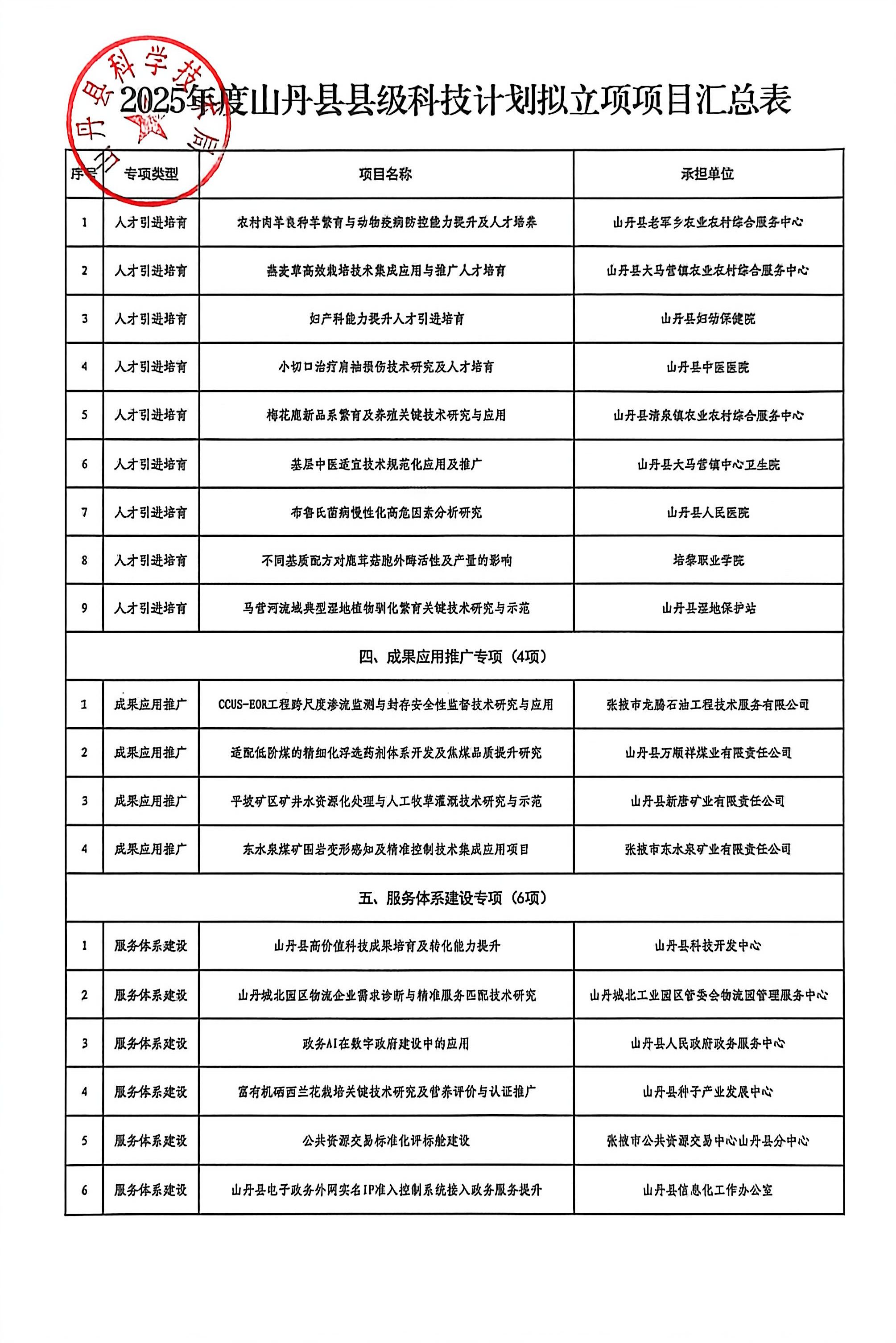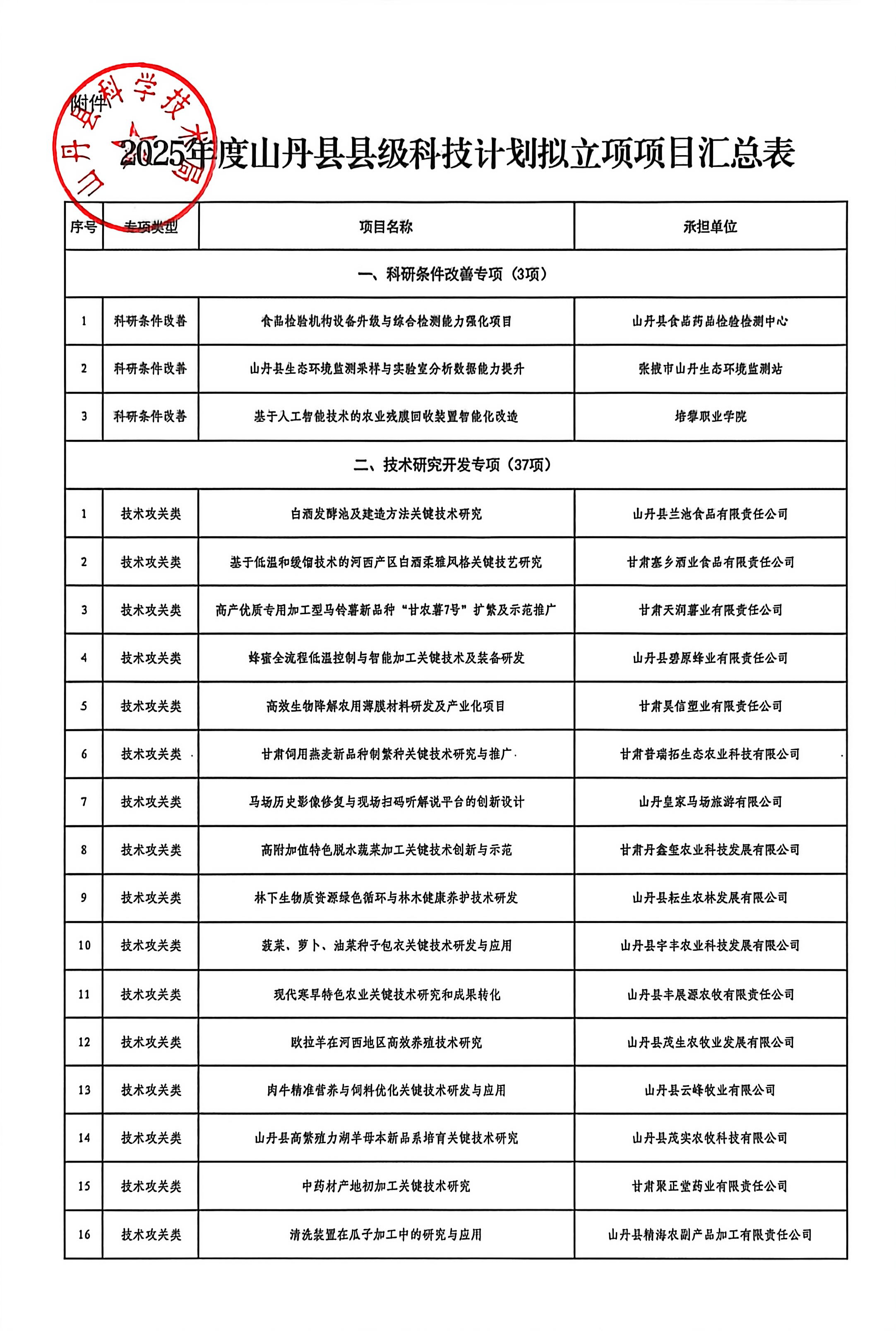 山丹县科学技术局 关于2025年度县级科技计划 拟立项项目的公示