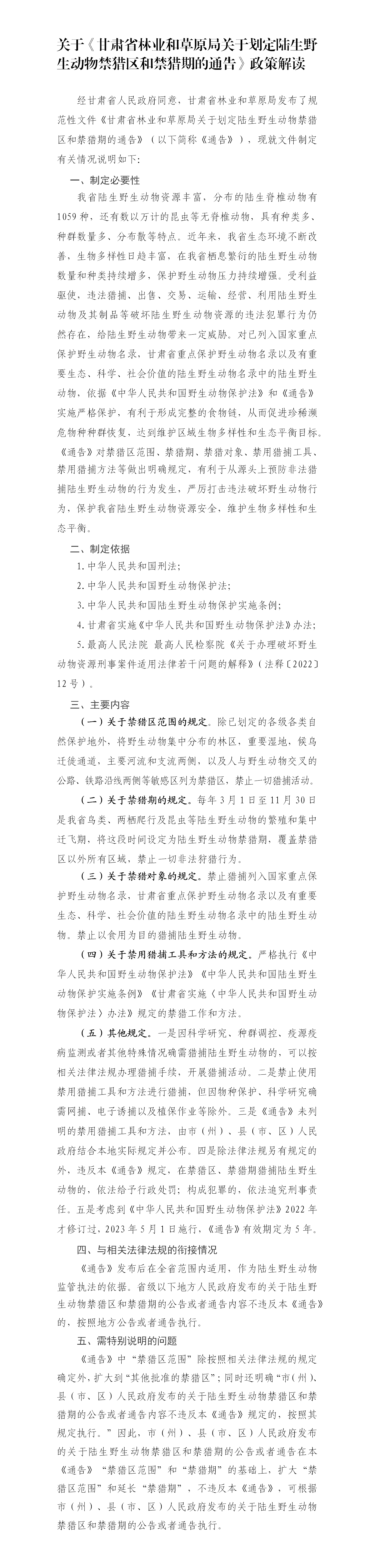 关于《甘肃省林业和草原局关于划定陆生野生动物禁猎区和禁猎期的通告》政策解读