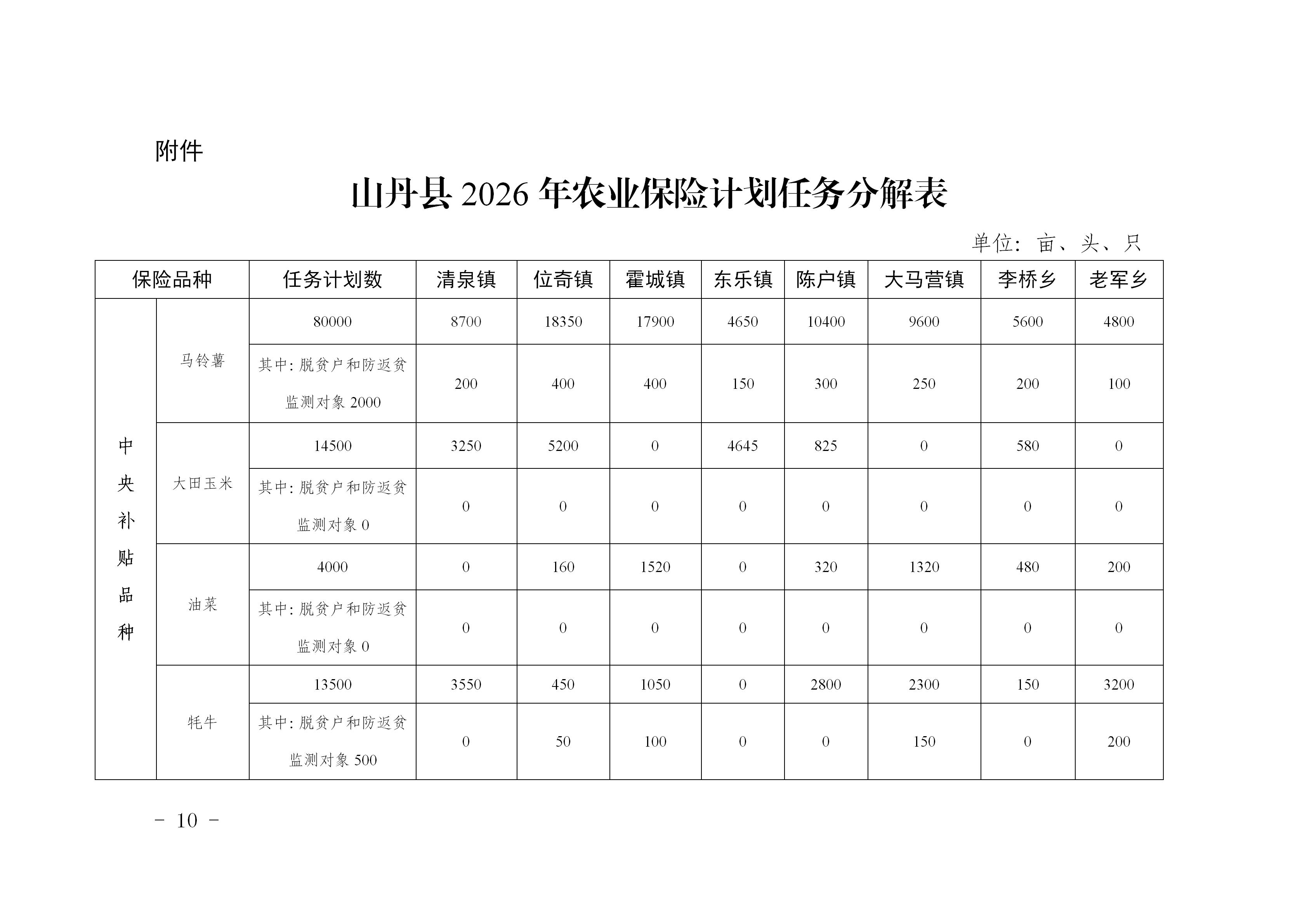 2026年农业保险承保业务采取分区域方式开展,其中:中国人民财产保险有限公司山丹支公司负责清泉镇、东乐镇农业保险承保工作;中国大地财产保险股份有限公司山丹支公司负责位奇镇农业保险承保工作;中国平安财产保险股份有限公司山丹支公司负责霍城镇、陈户镇、大马营镇、老军乡、李桥乡农业保险承保工作;中国平安财产保险股份有限公司山丹支公司负责清泉镇、东乐镇、陈户镇、大马营镇、李桥乡、老军乡“一县一(多)品”品种承保工作。各承保公司在所划分区域范围内开展相应政策性农业保险业务,不得随意调整承保范围,对不在相应区域内开展政策性农业保险的,不予申报核拨保费补贴资金。