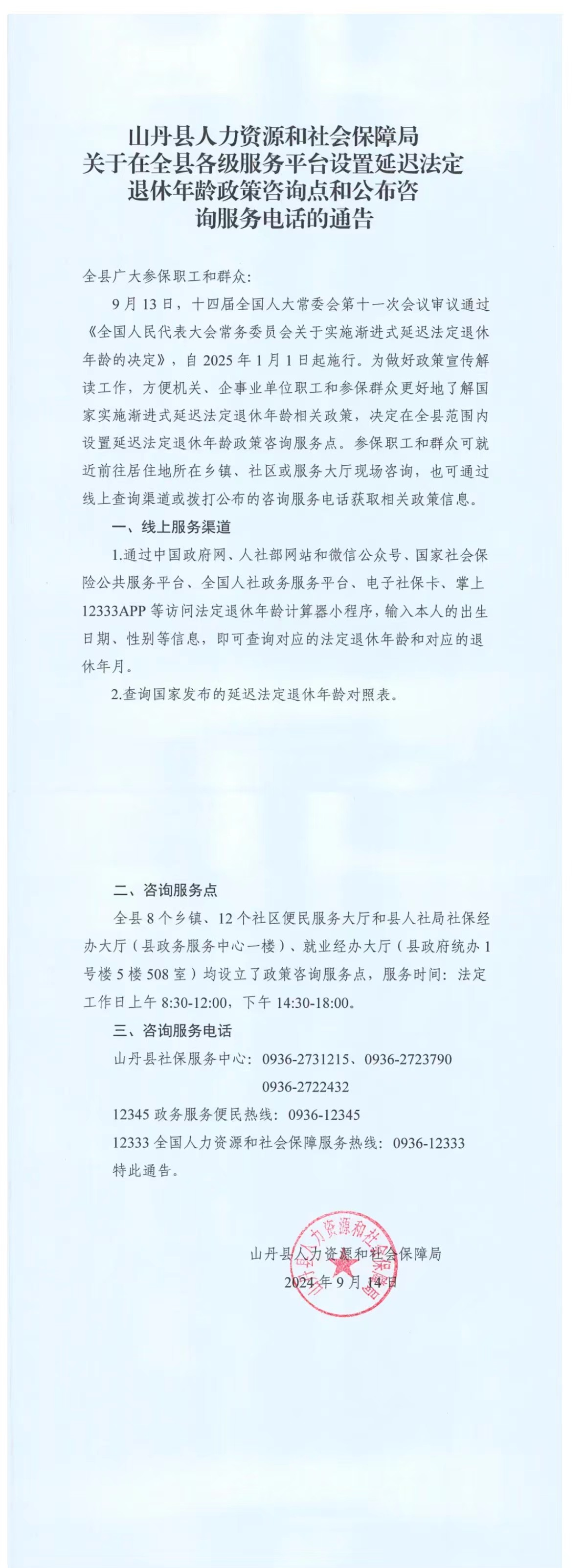 山丹县人力资源和社会保障局关于在全县各级服务平台设置延迟法定退休年龄政策咨询点和公布咨询延迟服务电话的通知
