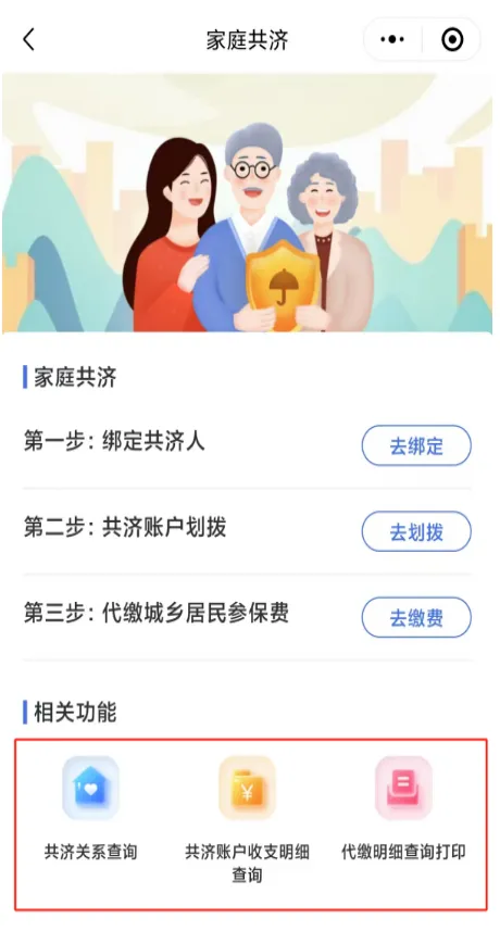 四、家庭共济代缴分为三步:绑定共济人、共济账户划拨、代缴城乡居民参保费。