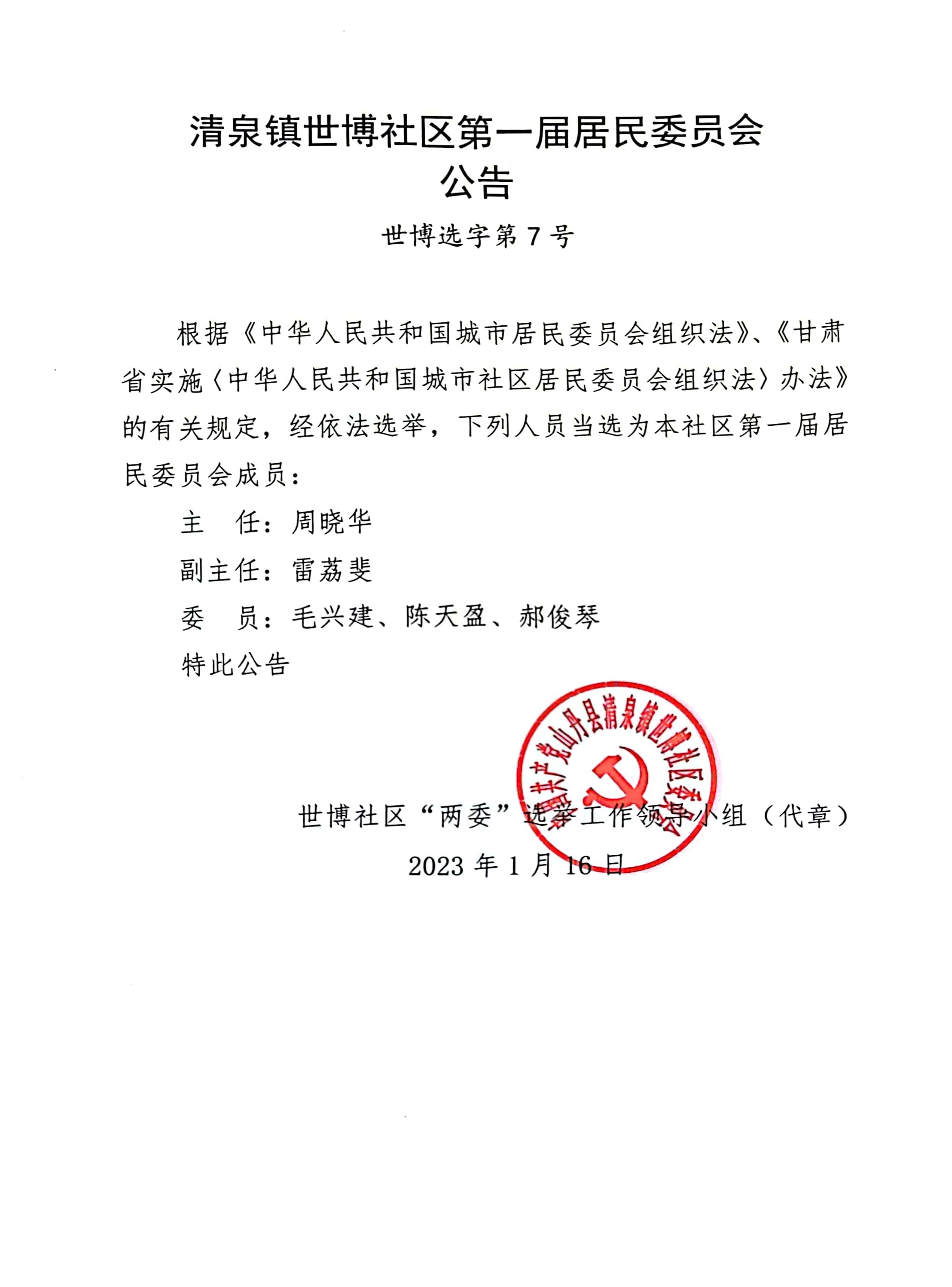 清泉镇世博社区第一届居民委员会选举结果