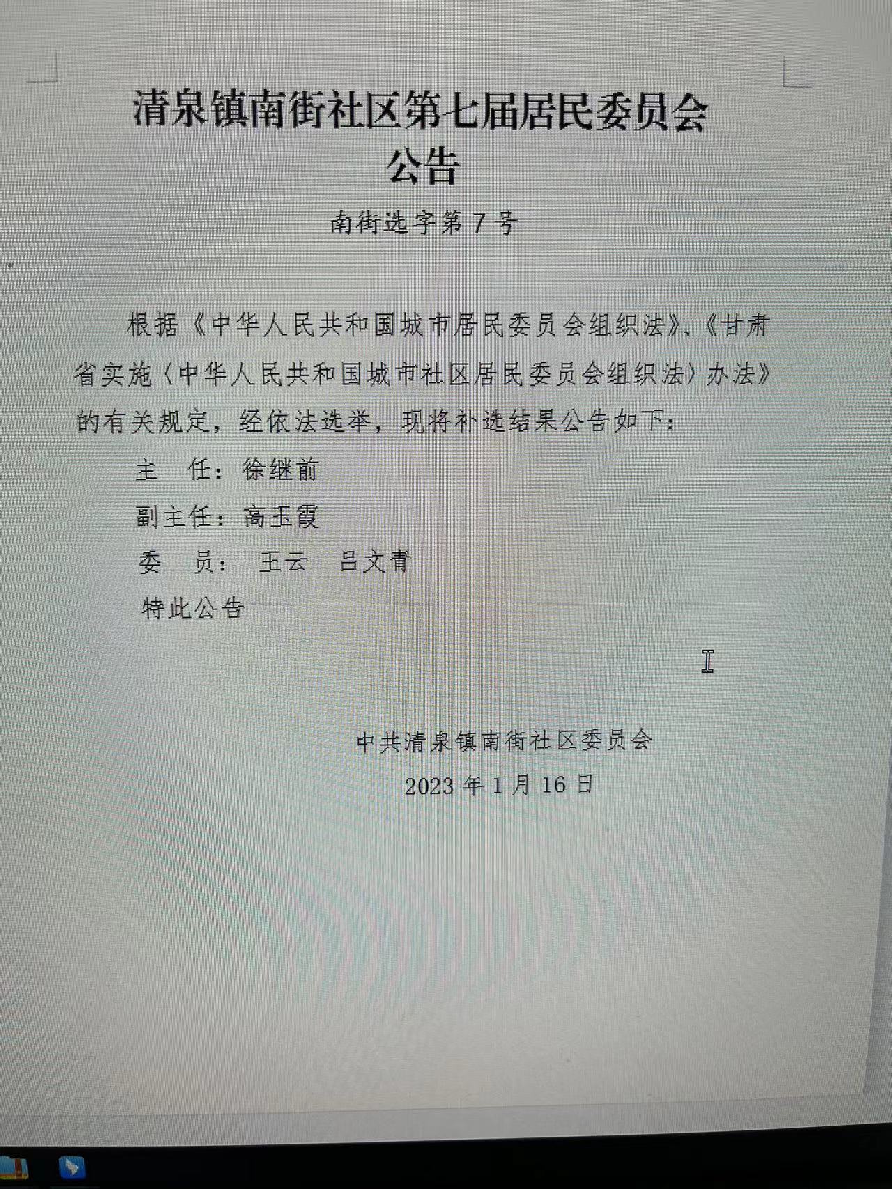 清泉镇南街社区第七届居民委员会公告