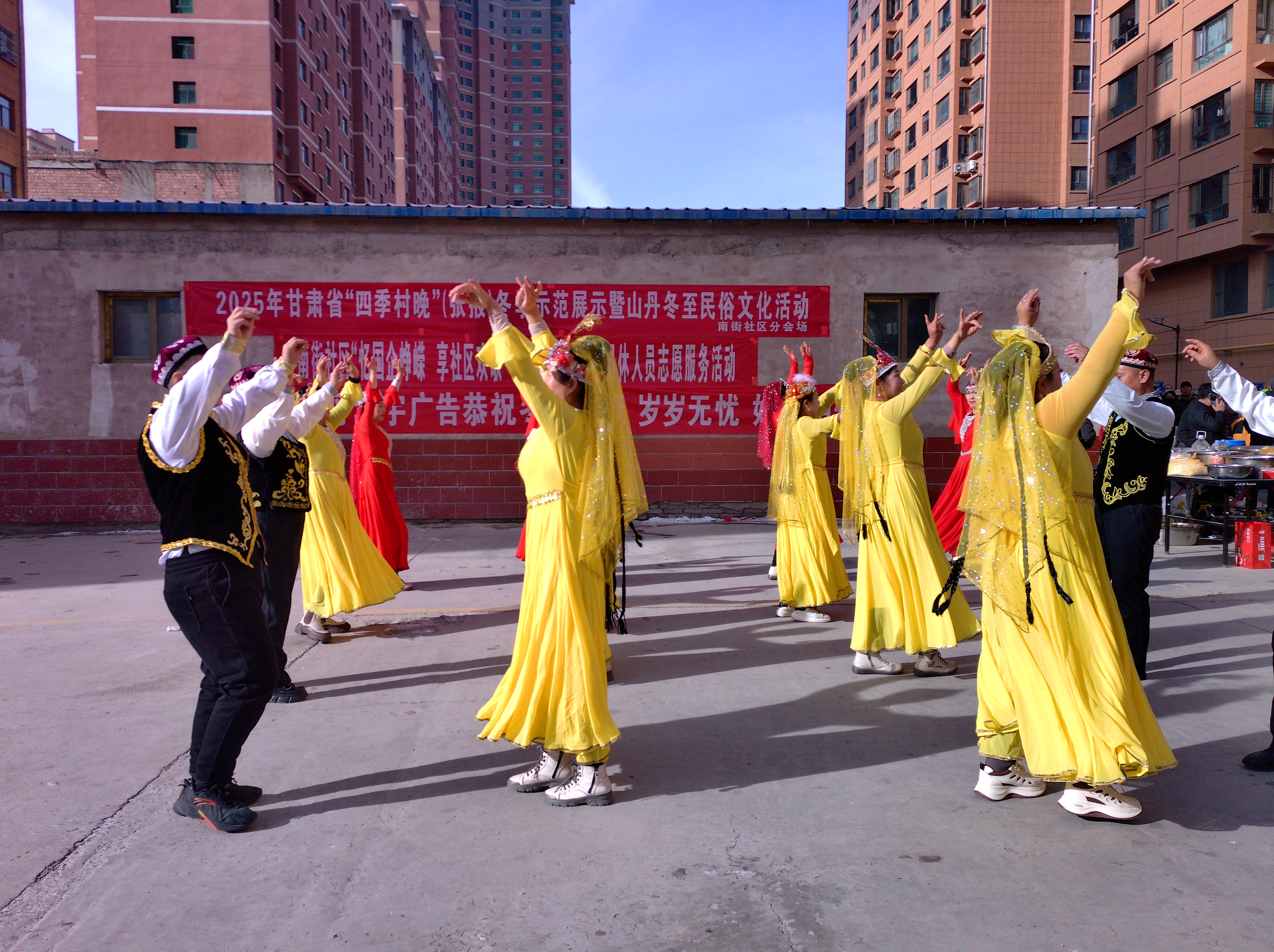 活动还未正式开始,小区广场就已人头攒动,居民们早早赶来占位等候。演出环节中,节目全部由社区居民自编自导自演,欢快喜庆的秧歌表演首先开场,演员们手持彩扇、踏着鼓点,扭胯摆腰、步伐轻快,红火的装扮、热闹的阵仗瞬间将现场氛围推向高潮;一支藏舞表演惊艳亮相,舞者们身着华丽的藏族服饰,甩袖、踏足、摆腰,动作舒展优美,洋溢着浓郁的高原风情,引得观众纷纷叫好;紧随其后的新疆舞表演同样精彩,演员们摆动腰肢、轻移舞步,灵动的姿态、明快的节奏尽显西北边陲的独特韵味,收获满堂喝彩;台下观众掌声、喝彩声此起彼伏,不少居民还拿出手机拍照录像,记录下这欢乐时刻。
