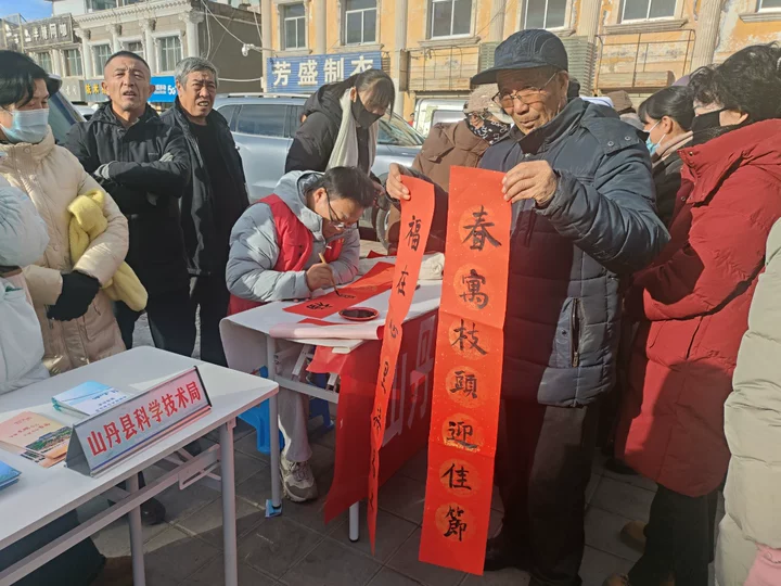 文艺演出之余,“文化科技卫生三下乡”活动同步开展,让居民在欣赏节目之余收获满满实惠。山丹县文联的书法家们现场挥毫泼墨,笔走龙蛇间,一幅幅寓意吉祥的春联跃然纸上。“龙腾瑞气进万家,马跃春风添福寿”“邻里和睦添喜气,新春如意纳吉祥”等春联,既饱含对新年的美好期许,又传递着邻里互助的温情,居民们争相挑选心仪的春联,脸上洋溢着幸福的笑容。同时,现场设置的科技咨询、卫生健康服务专区,工作人员耐心为居民解答疑问,普及实用知识,让惠民服务真正送到居民心坎上。