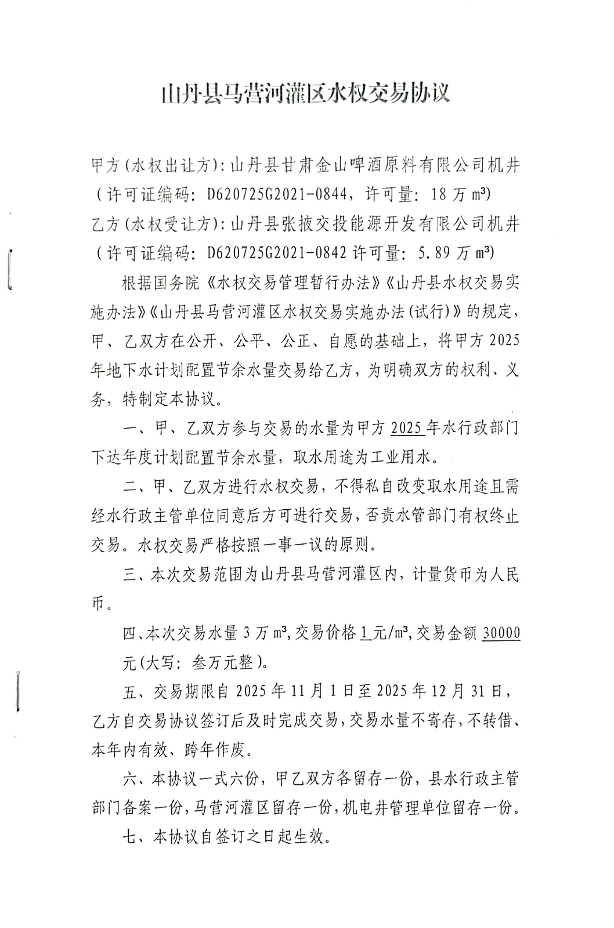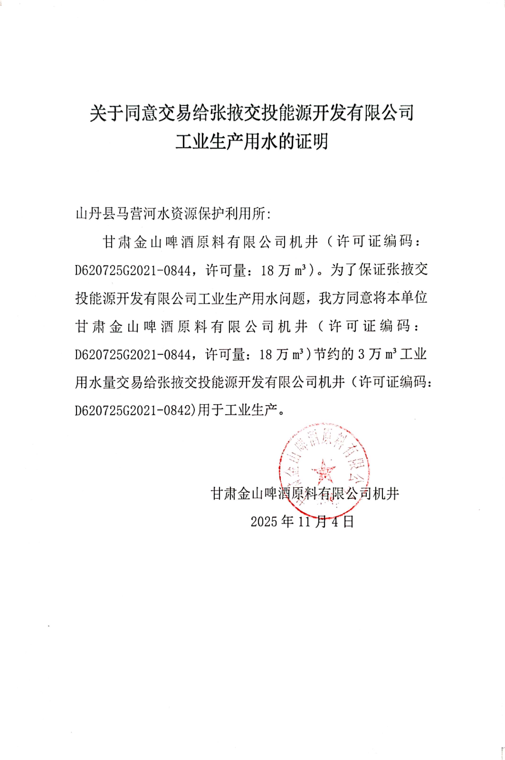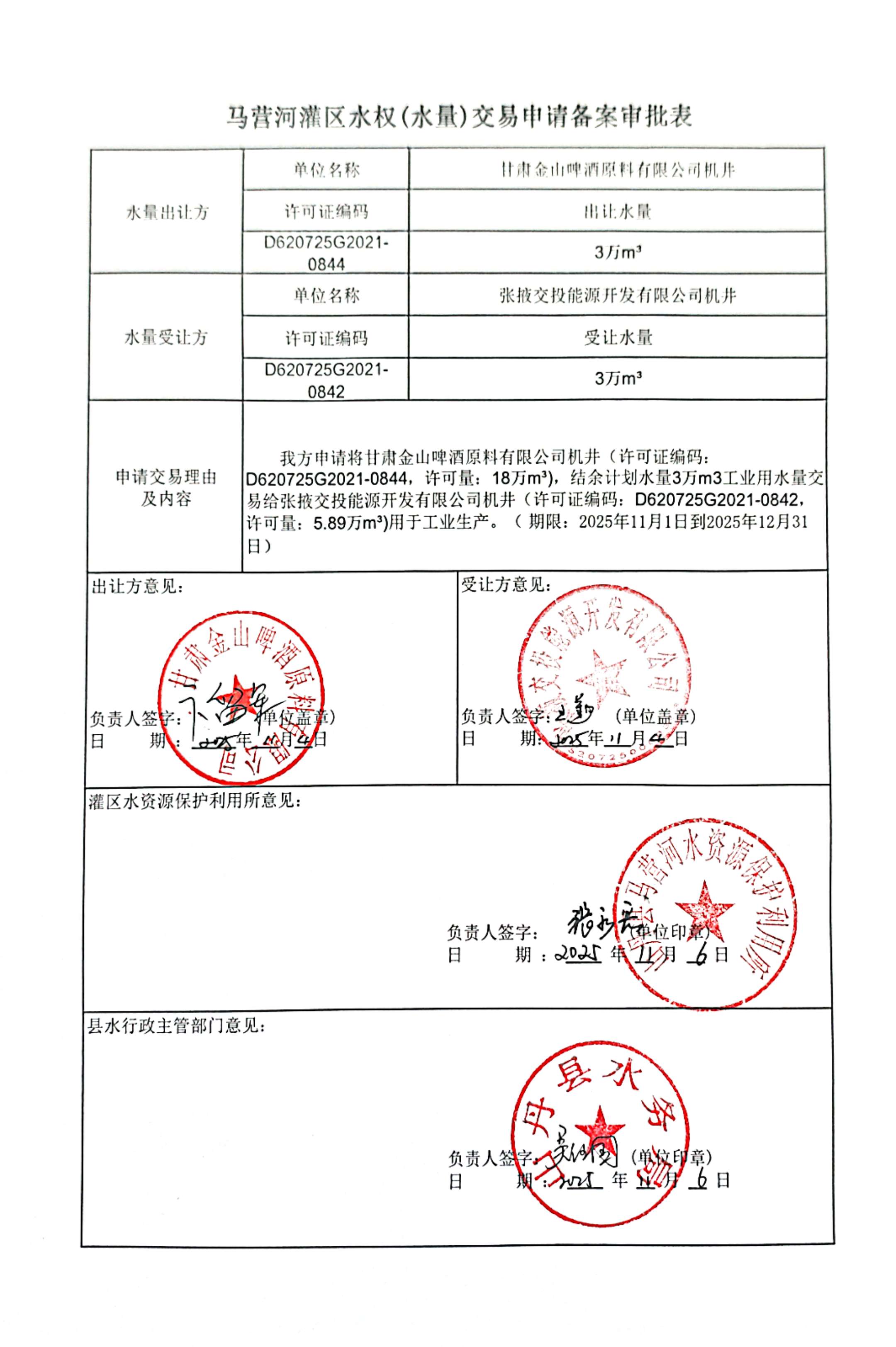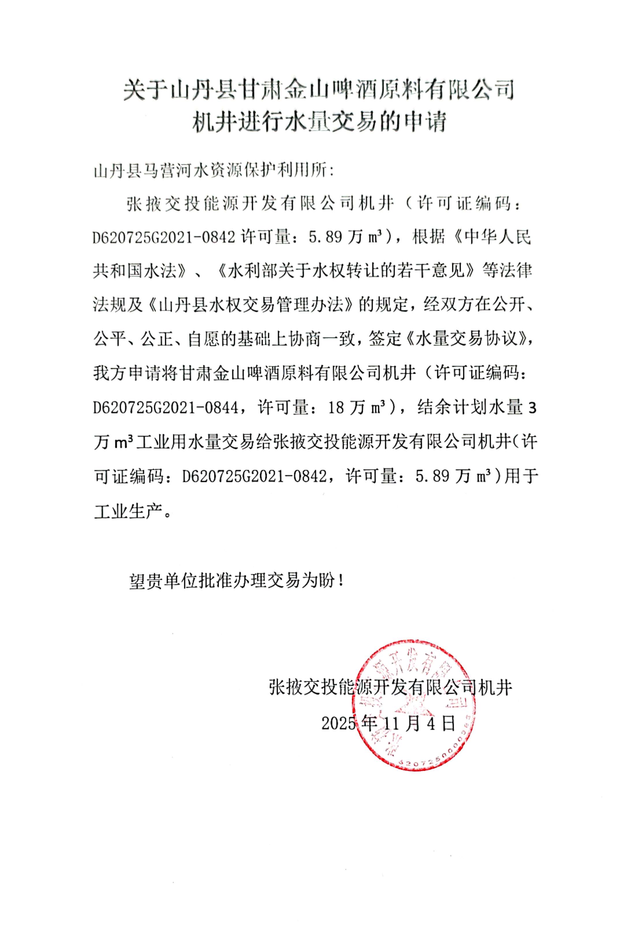 关于山丹县甘肃金山啤酒原料有限公司机井进行水量交易的申请