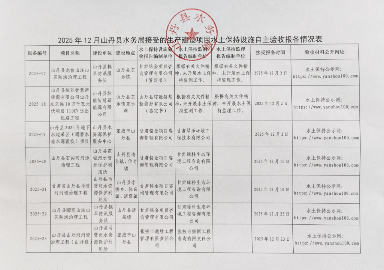 山丹县水务局2025年12月接受的生产建设项目水土保持设施自主验收报备的公告
