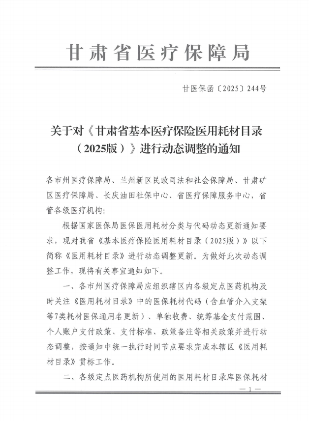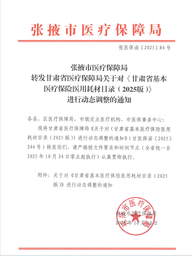 张掖市医疗保障局转发甘肃省医疗保障局关于对《甘肃省基本医疗保险医用耗材目录(2025版)》进行动态调整的通知