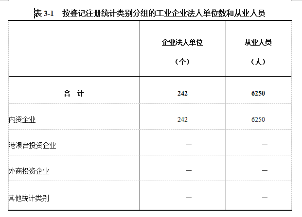 在工业企业法人单位从业人员中,内资企业6250人,占100%(详见表3-1)。