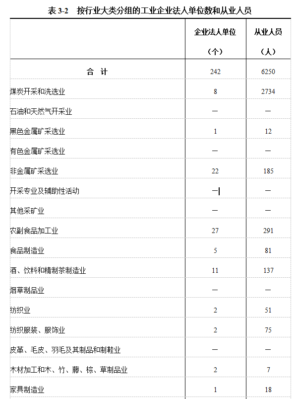 在工业企业法人单位从业人员中,采矿业2931人,制造业2737人,电力、热力、燃气及水生产和供应业582人,分别占18.64%、71.26%和10.10%。在工业行业大类中,煤炭开采和洗选业,非金属矿物制品业,电力、热力生产和供应业从业人员数位居前三位,分别占43.74%、18.24%和5.49%(详见表3-2)。