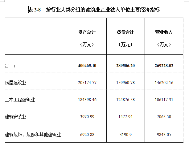 2023年,建筑业企业法人单位全年实现营业收入269228.02元,比2018年增长69.79%(详见表3-8)。